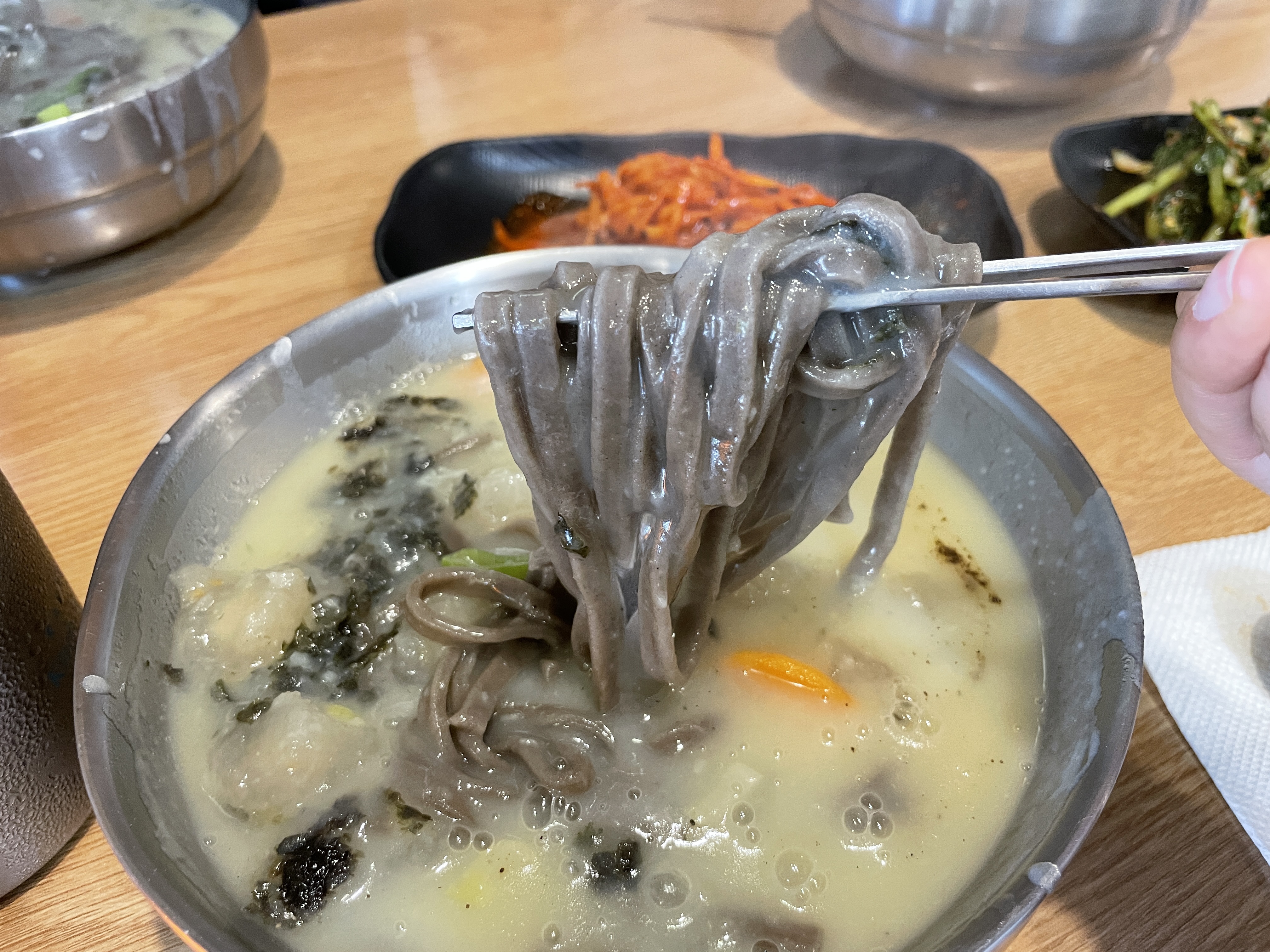 무채김치에 감탄하면서 리필을 요청한 뒤 기다리니 드디어 옹심이 칼국수가 나옵니다. 국물에 감자 또는 메밀가루를 넣어서 걸쭉하고 든든하면서도 구수한 맛이 났어요.
