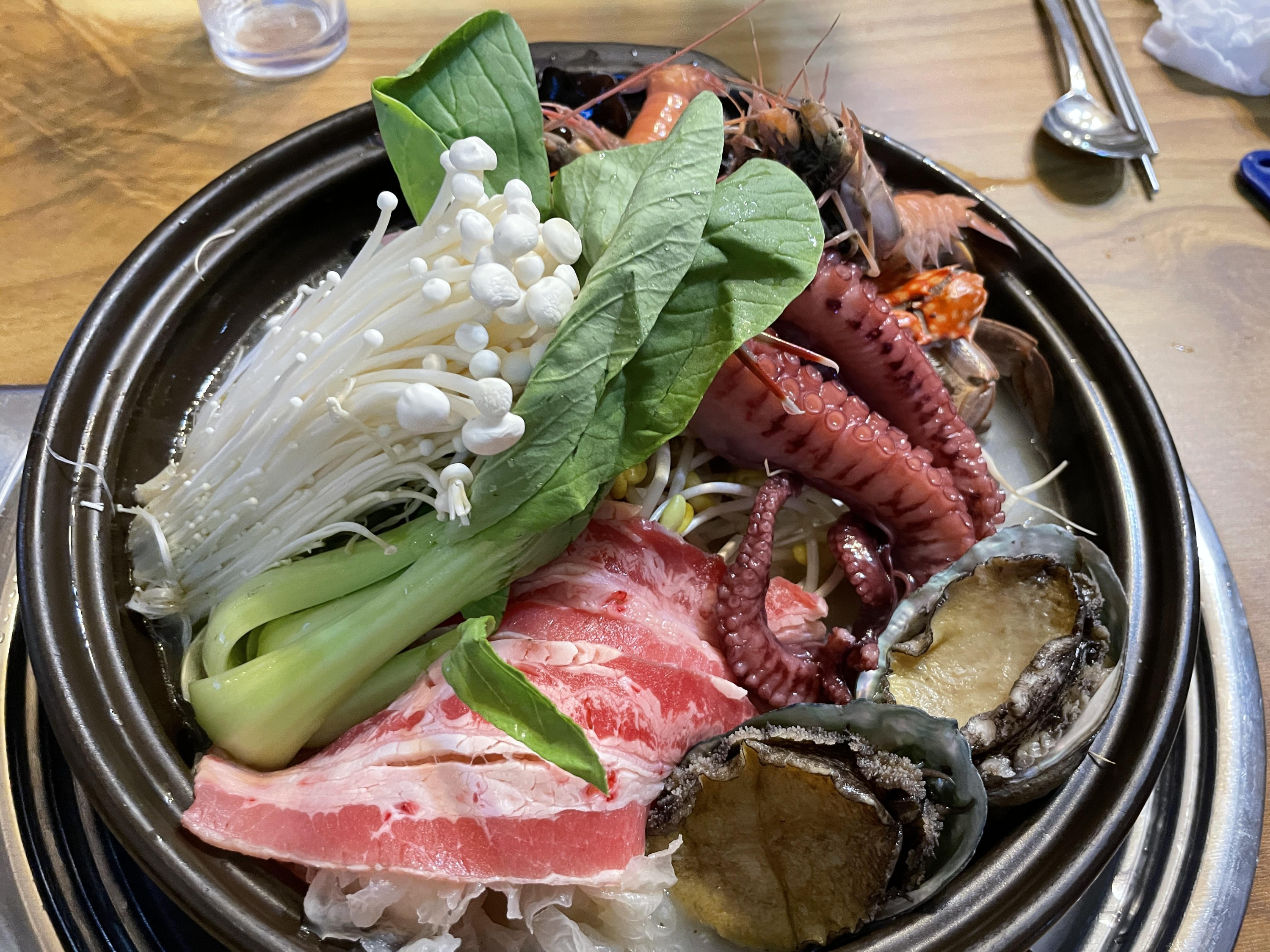 안에는 흰목이버섯이 큼지막하게 들어가 있어서 보들거리는 식감이 예상됩니다. 국물이 끓기 시작하면 안내된대로 해물손질해서 먹으면 되는데 직원분께서 웬만하면 해주십니다. 역시 전문가가 만져야 금방되더라고요. 해산물 본연의 맛을 즐기면서 먹다보면 국물이 더욱 우러나기 시작합니다. 그때 만두를 하나씩 샤브샤브처럼 넣어서 먹습니다.