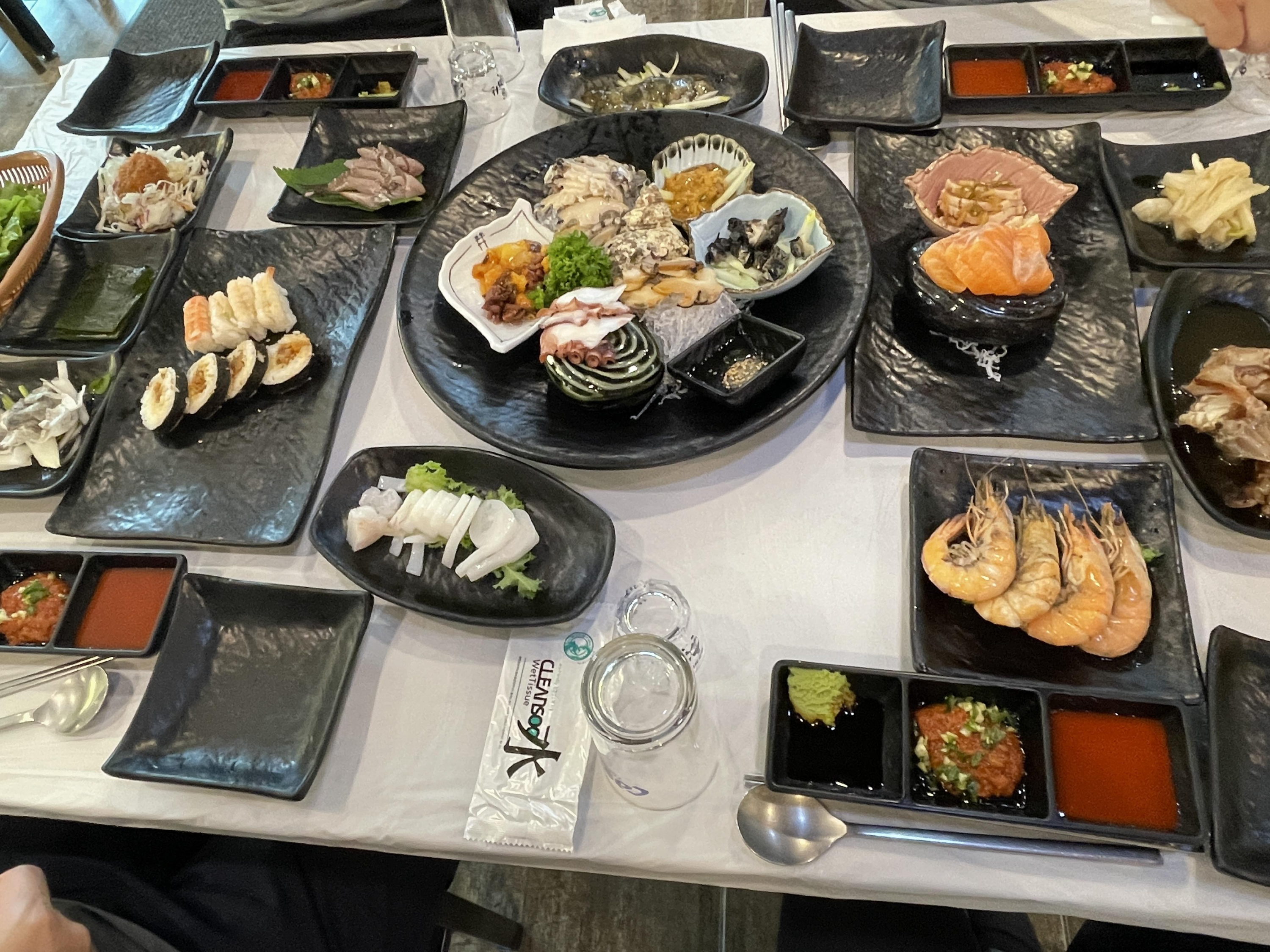 코스 4인분을 주문하니 스끼다시가 화려하게 깔리시 시작합니다. 순식간에 차려지는데 새우찝, 간장게장, 한치회, 돔껍질 무침, 초밥, 연어, 샐러드 등이 나오고 해물모둠이 함께 나옵니다.
