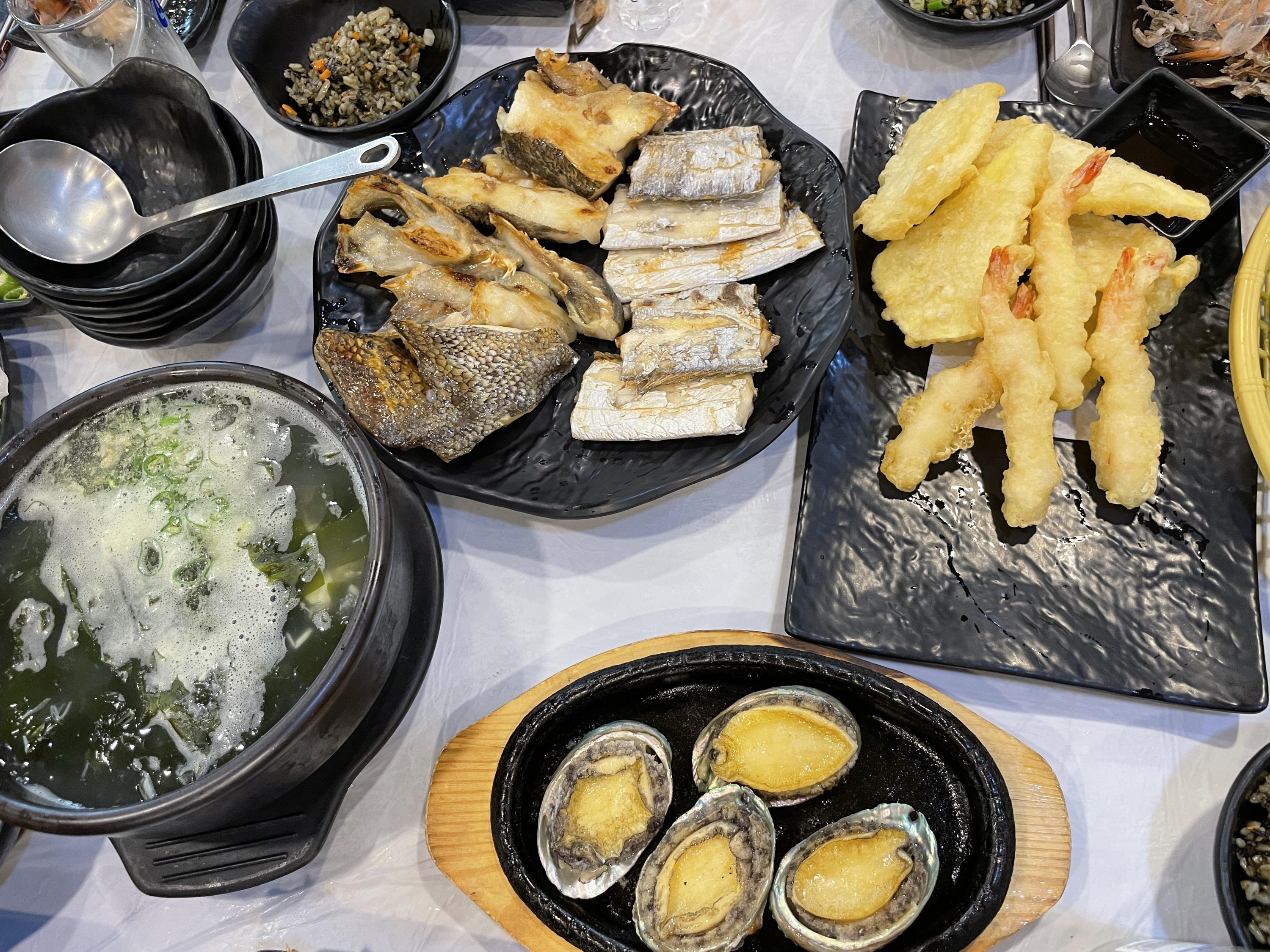 회를 먹고 있으니 미역국, 생선구이, 튀김, 전복구이, 게우밥이 나옵니다.