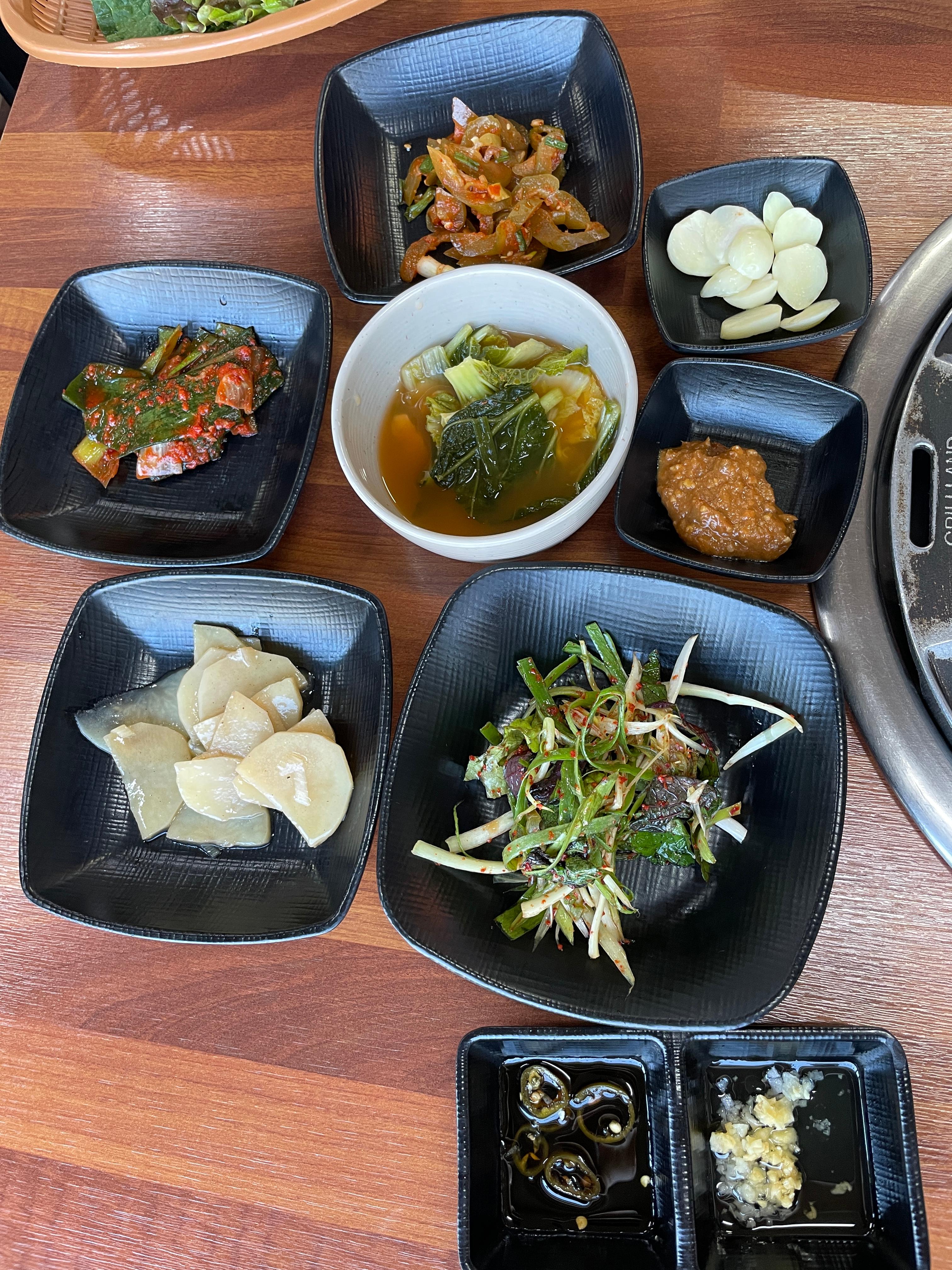 갈매기살 2인분 주문했습니다. 밑반찬은 물김치, 파김치 등이 나오는데 깔끔하고 좋아요. 나머지는 셀프로 갖다먹을 수 있어요.