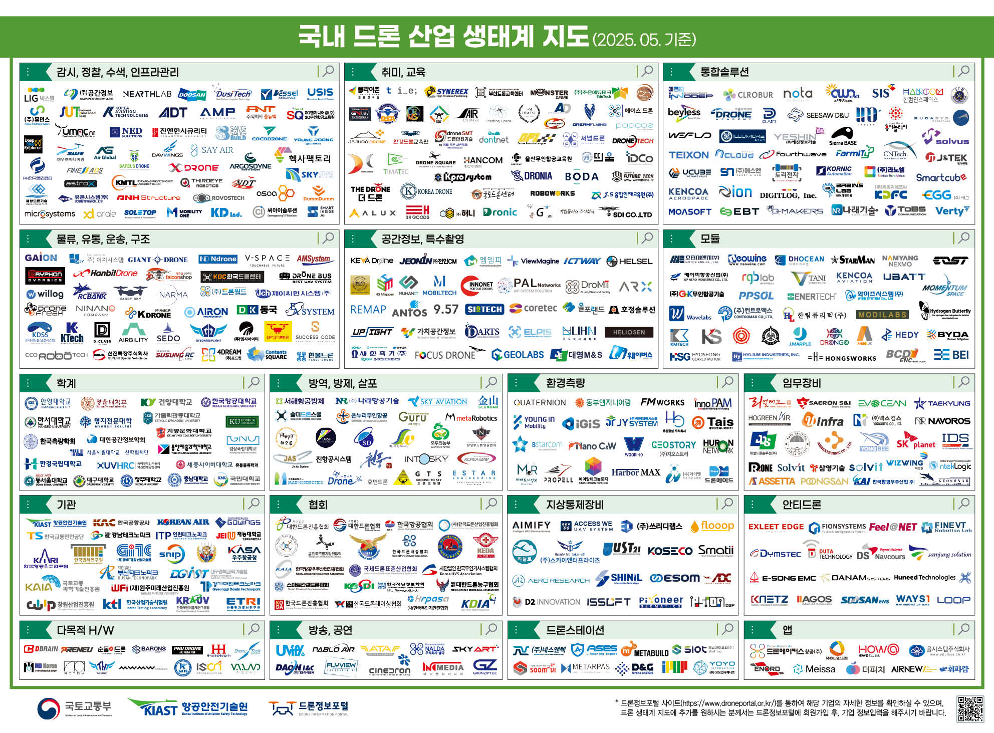 현재 국내 드론산업을 한 눈에 볼 수 있는 생태계 지도입니다. 업체뿐만 아니라 교육, 공공기관 등도 나와있어 이해하는데 도움이 될 거에요.