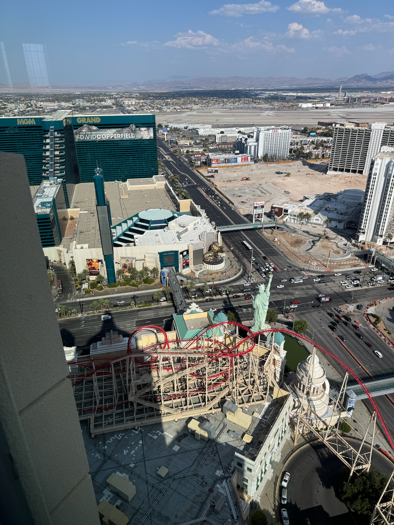 MGM도 메리어트본보이에 들어가는데 방에서 바로 다 보이고요. 데이비드 카퍼필드 아저씨 쇼 고아고를 바로 볼 수 있습니다. 특히나 여기는 공항뷰가 됩니다. 자유의여신상 윗모습도 볼 수 있고 호텔안에 롤러코스터있는 것도 볼 수 있었어요.