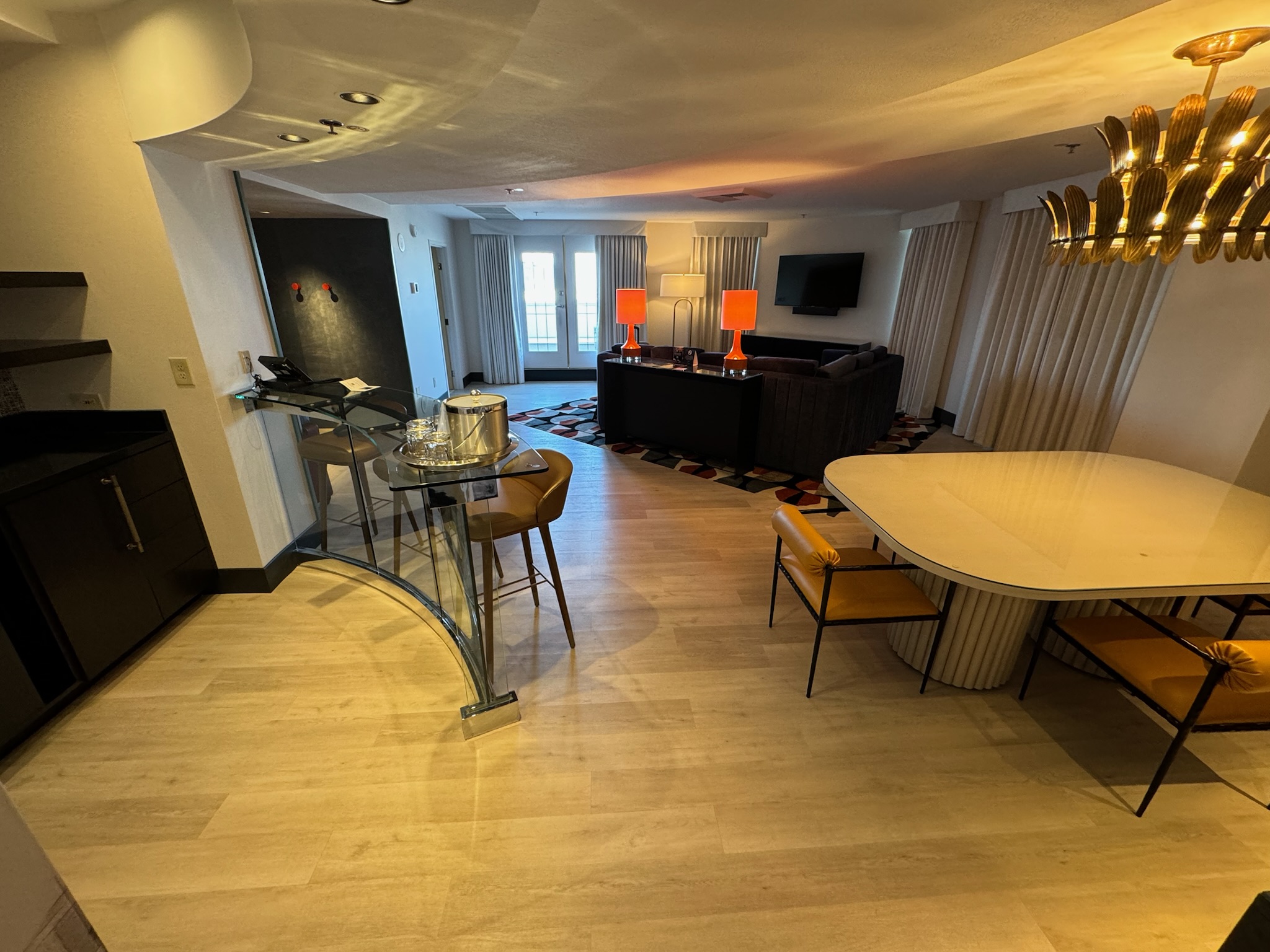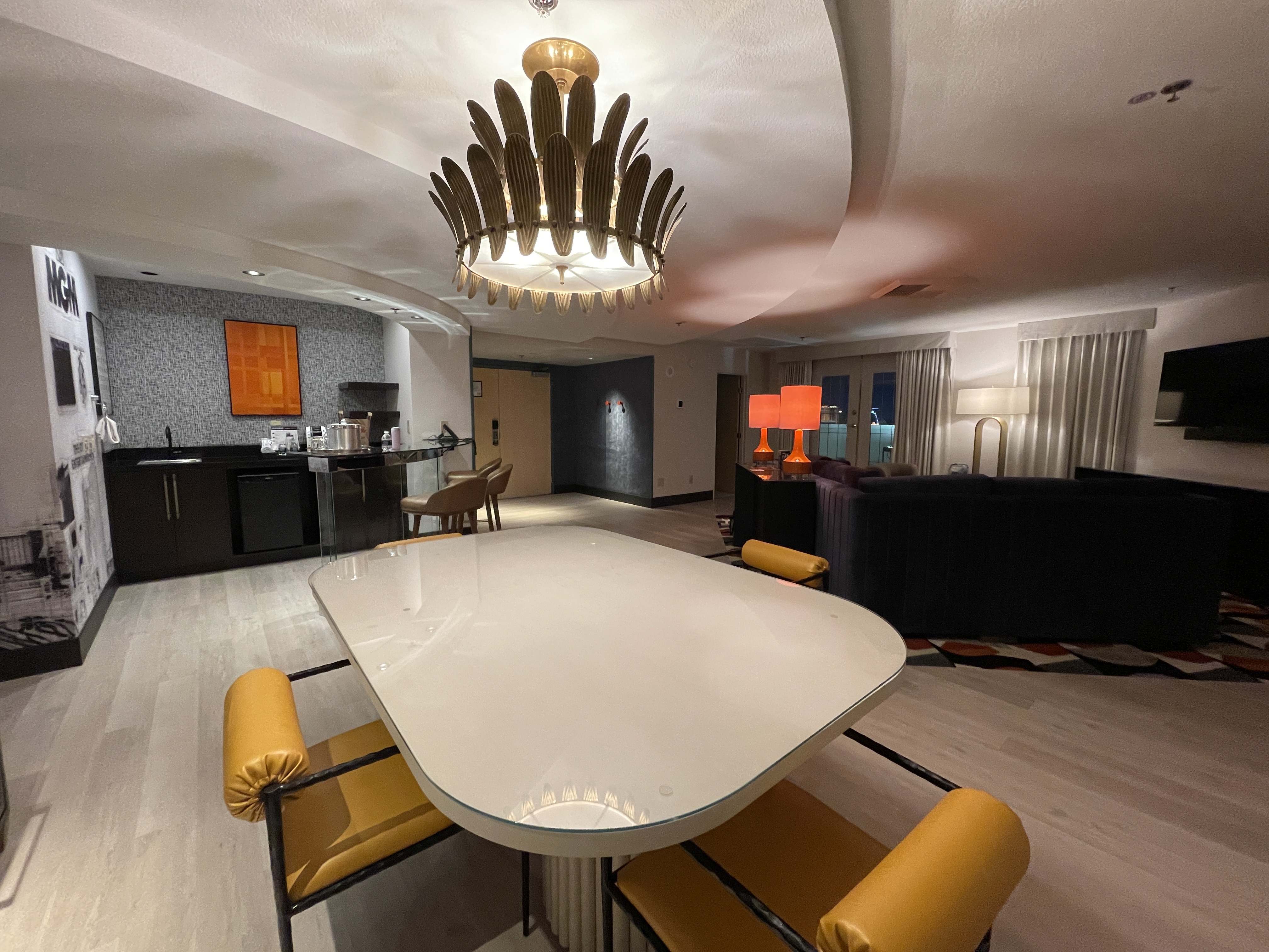 응접실 조명이 화려하네요. 이 식탁에 앉을 일이 없어서 나중에 아이스크림을 여기서 먹었어요.