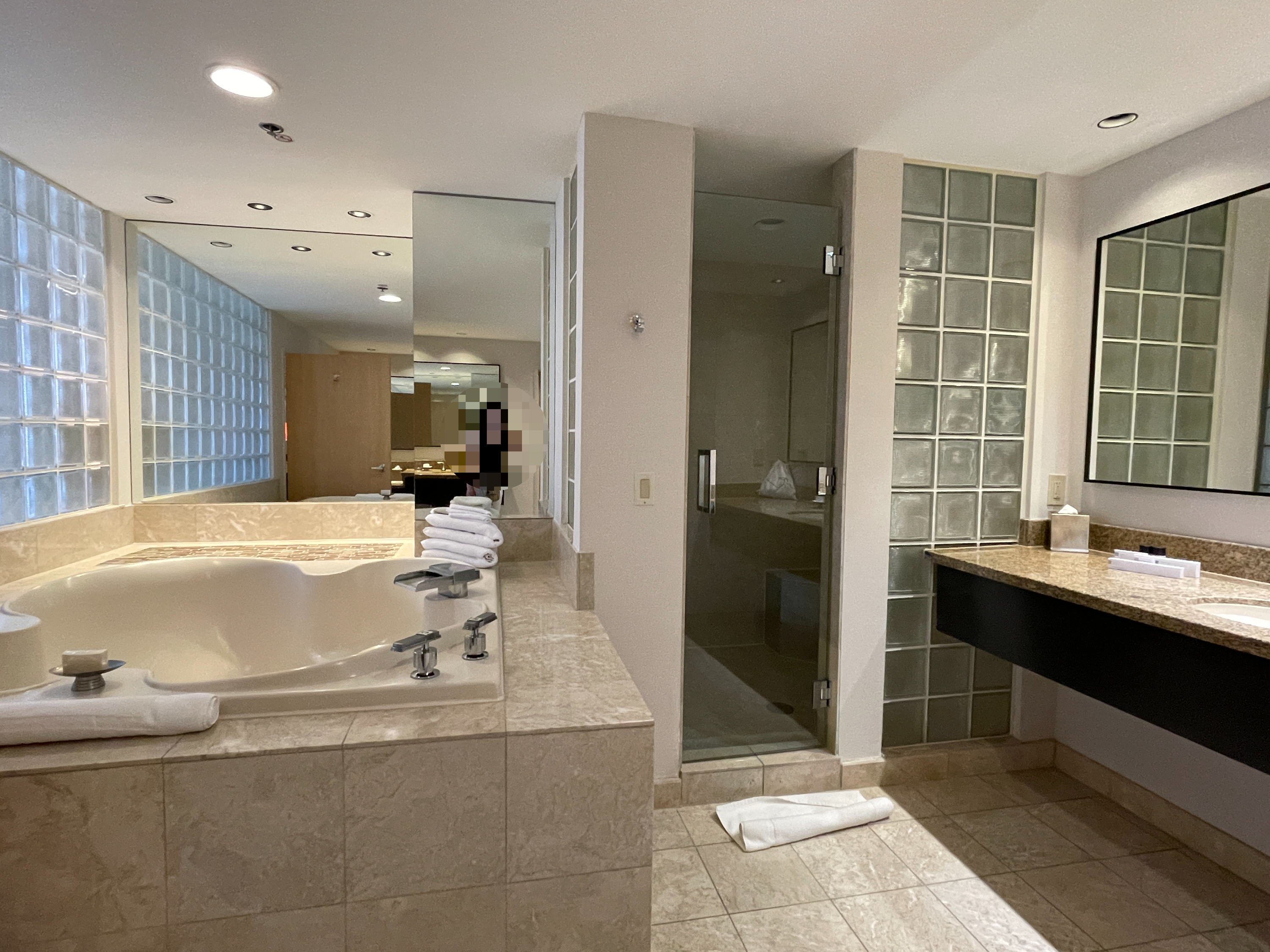 침실에 있는 욕실은 침실보다 넓어요. 오버하면 4명도 들어갈만한 월풀욕조, 분리된 샤워실, 넓은 세면대.