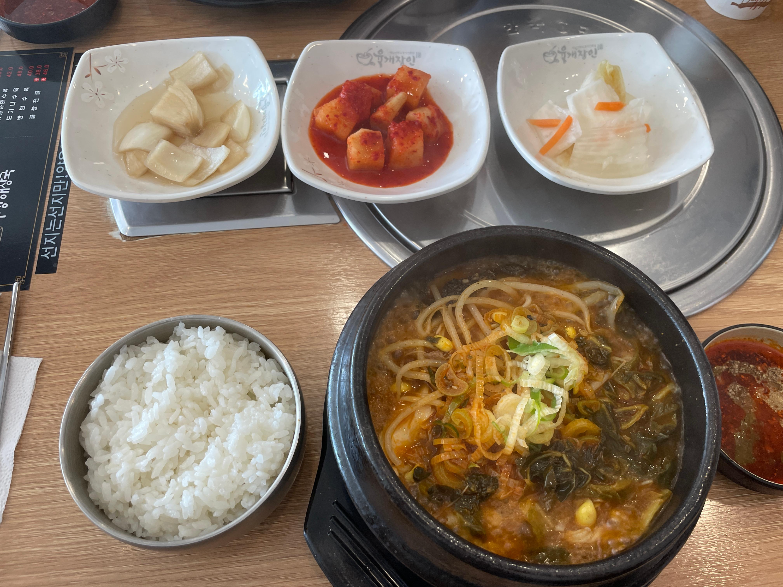 기본반찬으로 양파장아찌, 깍두기, 백김치가 나옵니다. 뚝배기에 콩나물, 우거지와 양 등이 들어가 있습니다.