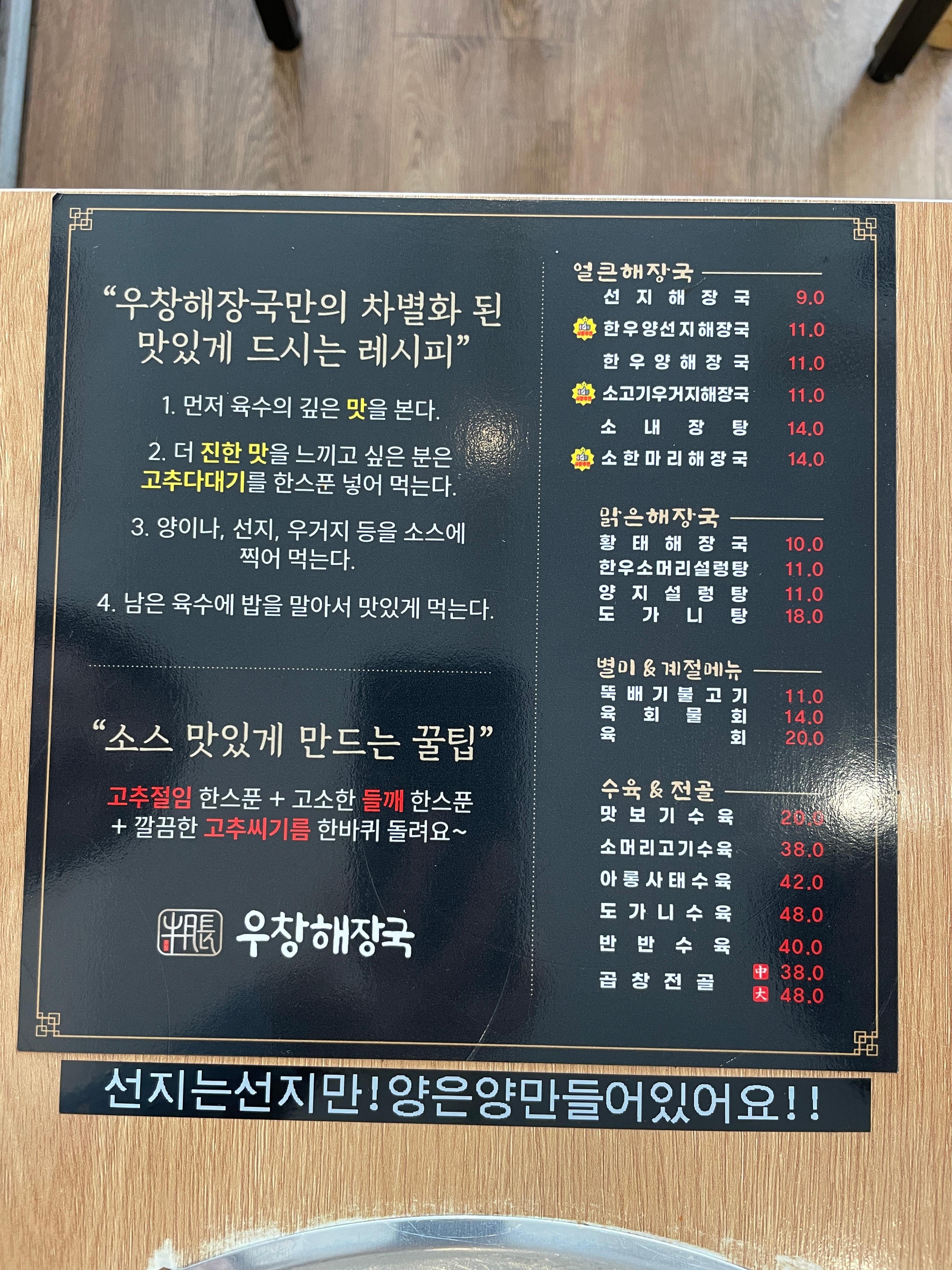 우창해장국 메뉴 및 가격