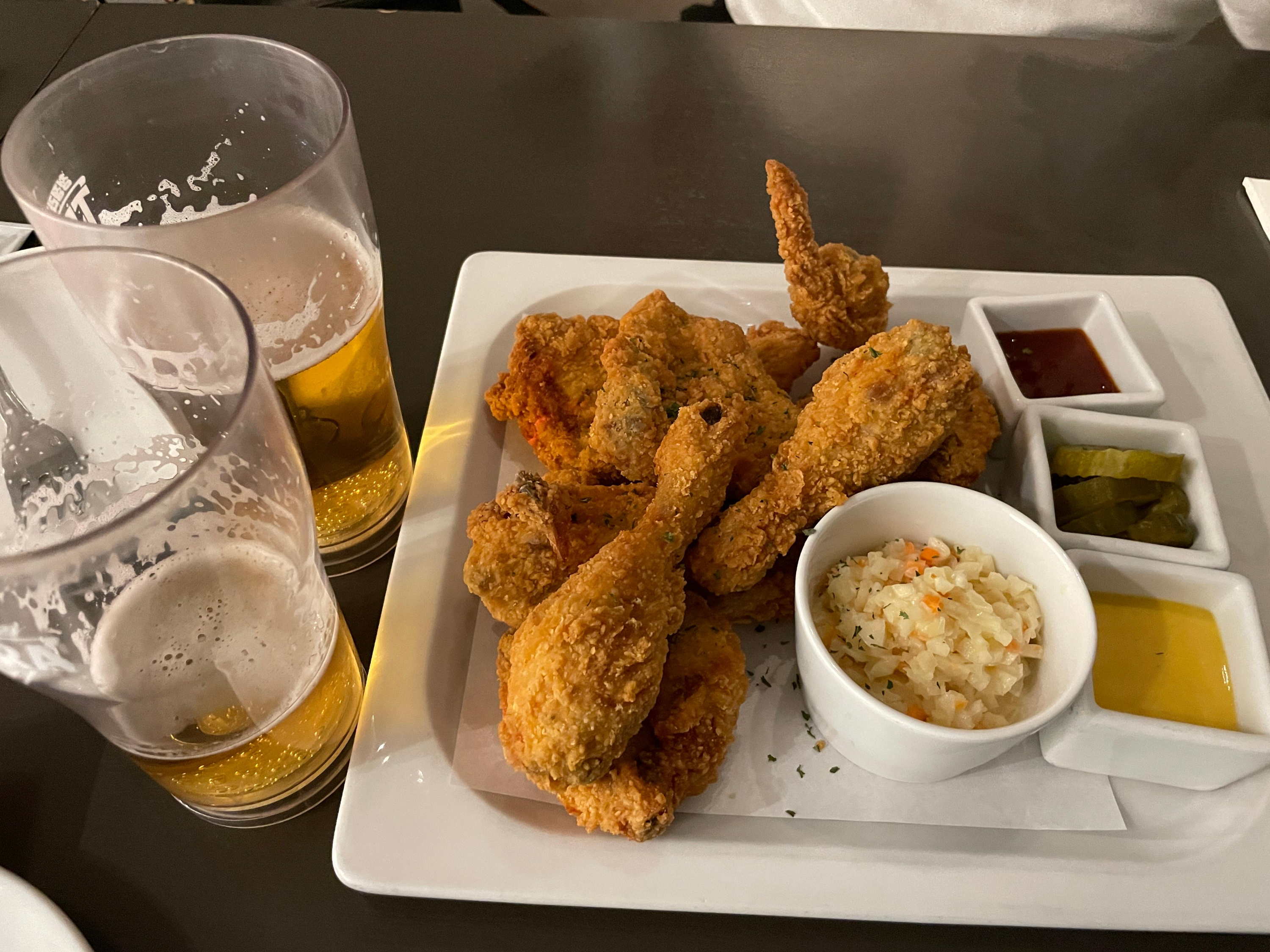 맥주 무한리필은 2인이 가면 모두 주문해야 가능하다고 해서 2개 주문했는데 단점이 좀 있어요. 우선 플라스틱 컵이라는 것, 셀프 리필해야한다는 것. 1잔씩 주문하면 유리잔에 서빙해주고요. 무한리필에는 약간의 노고가 필요합니다. 다행히 편한 신발 신고 있었기때문에 무리 없었고요. 치킨은 양도 괜찮고 맛있었어요. 사이드로 나오는 코울슬로도 맛있었고요.