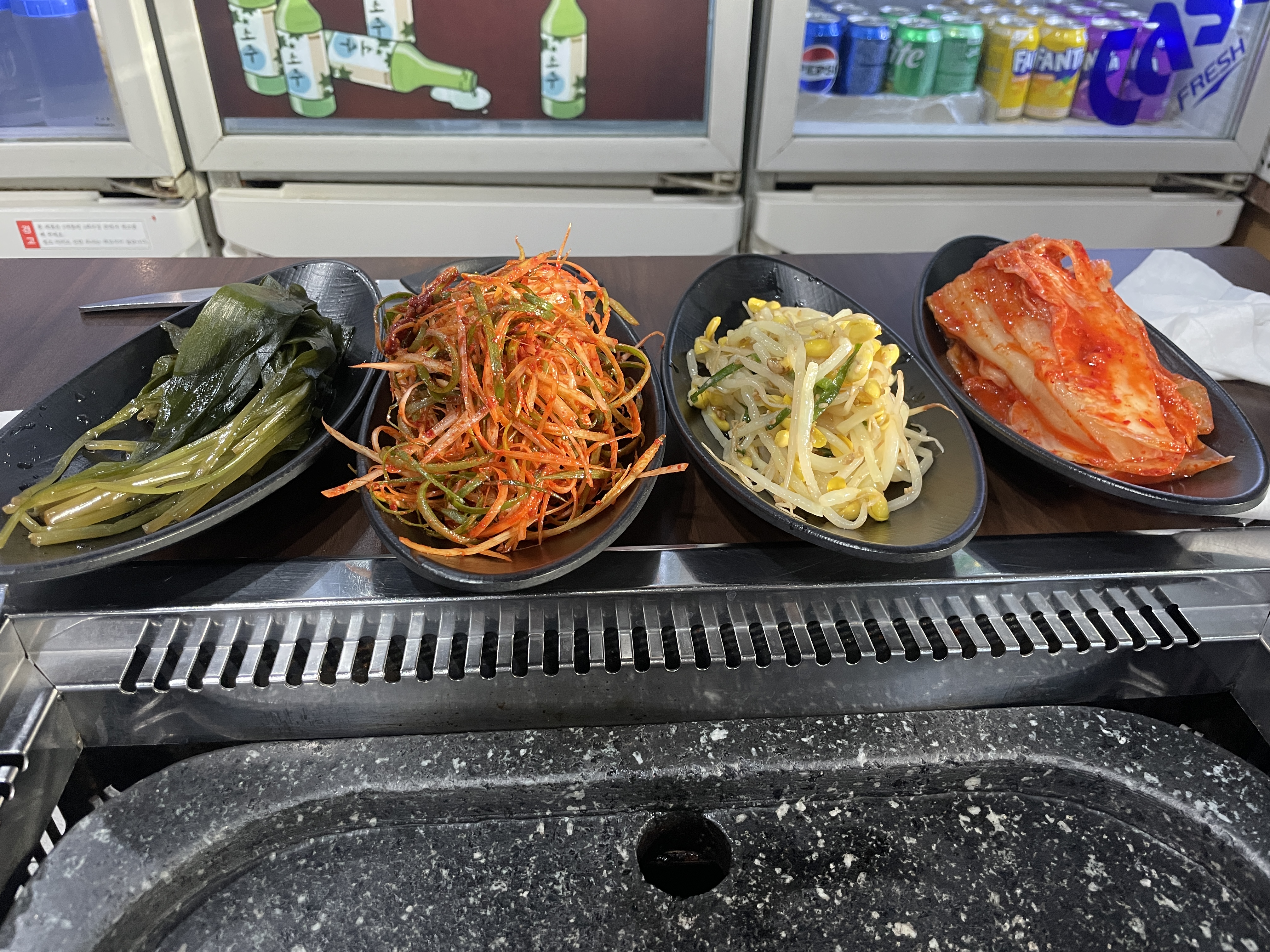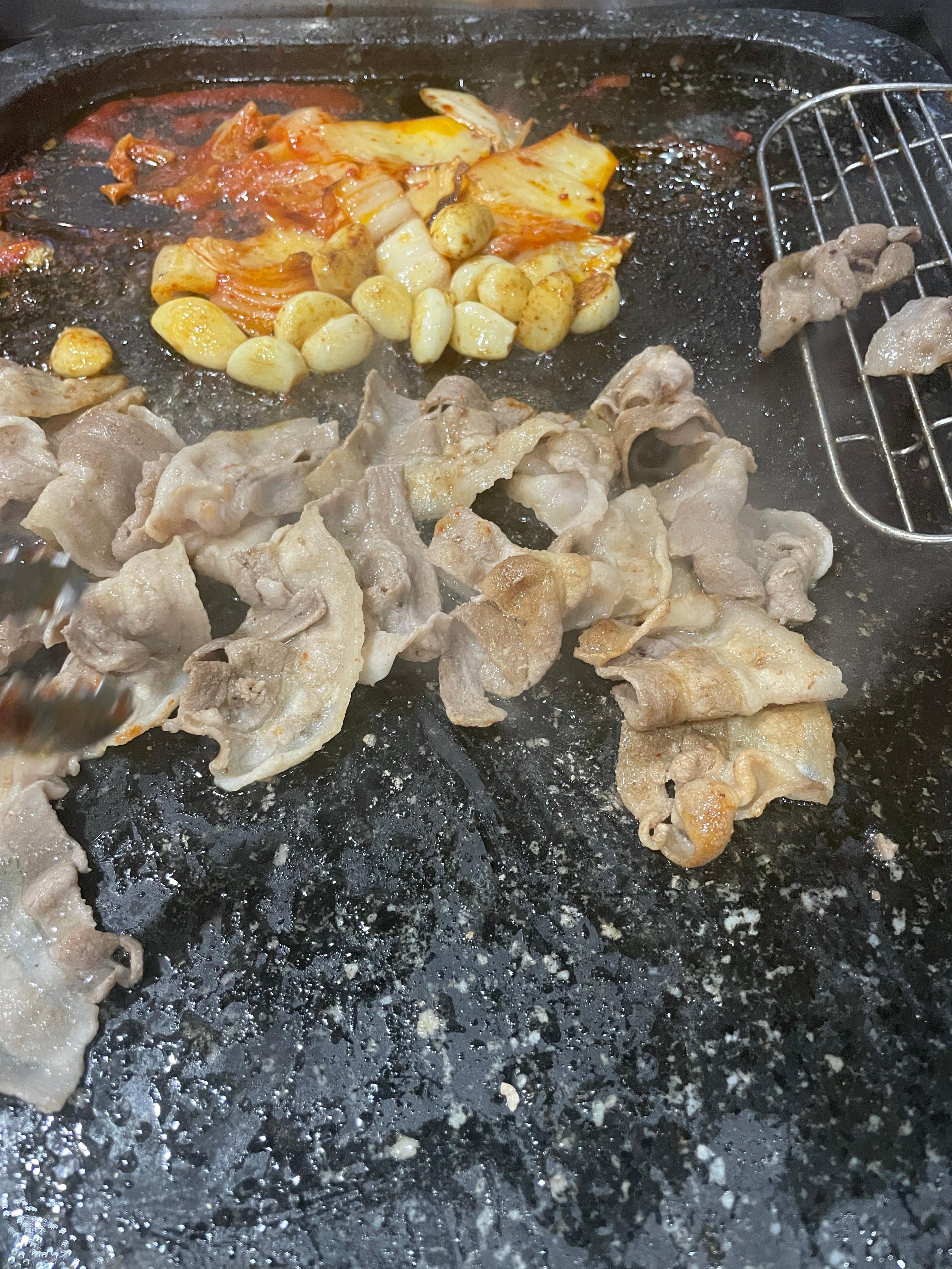 기름 빠지는 곳에 김치와 콩나물을 얹어줍니다. 여기 밑반찬도 맛있고 고기도 상태 좋고 다른 채소들도 매우 신선하고 게다가 술이 1500원. 정말 이날 맥주 한 잔 못 마셔서 아쉬웠어요. 고기가 익어가면서 치즈도 녹는데 고기에 치즈녹인거 싸 먹는걸 아이들이 매우 좋아했어요. 돌판이 커서 3-4명이 가서 먹으면 더 좋겠더라고요. 2인이 가서 먹기에는 불판이 아까운 느낌이죠.