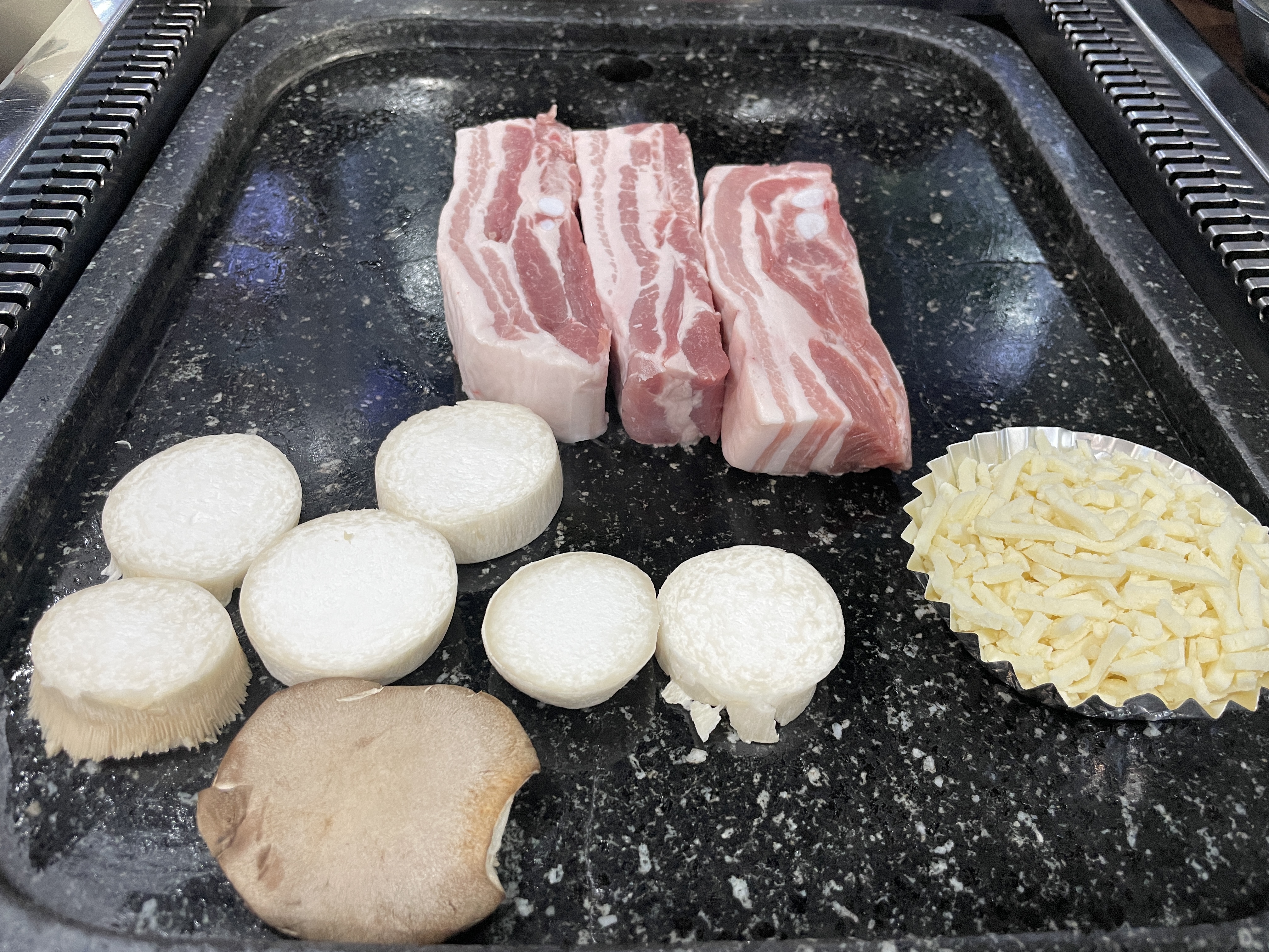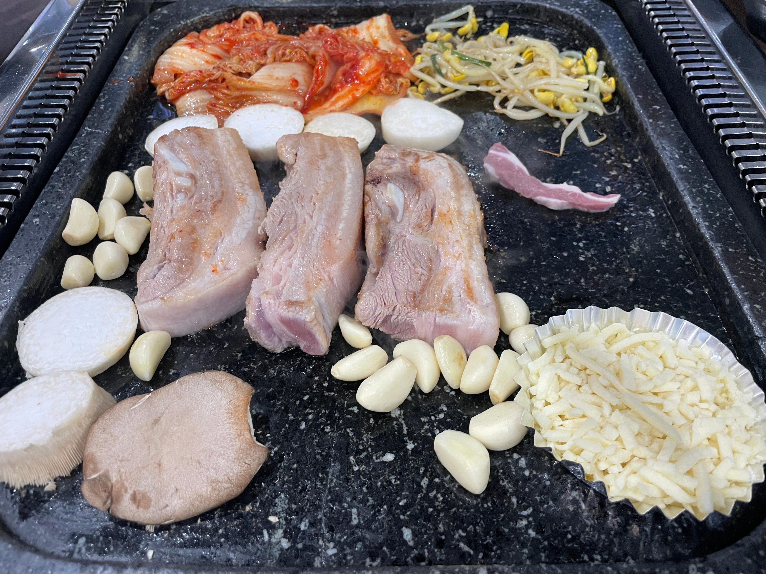 삼겹살과 가브리살을 시켰어요. 버섯과 치즈가 같이 나옵니다. 돌판은 데우기까지 시간이 좀 걸리니 이때 얇은 고기하나를 구우면서 기다리는 것도 괜찮을 것 같아요.