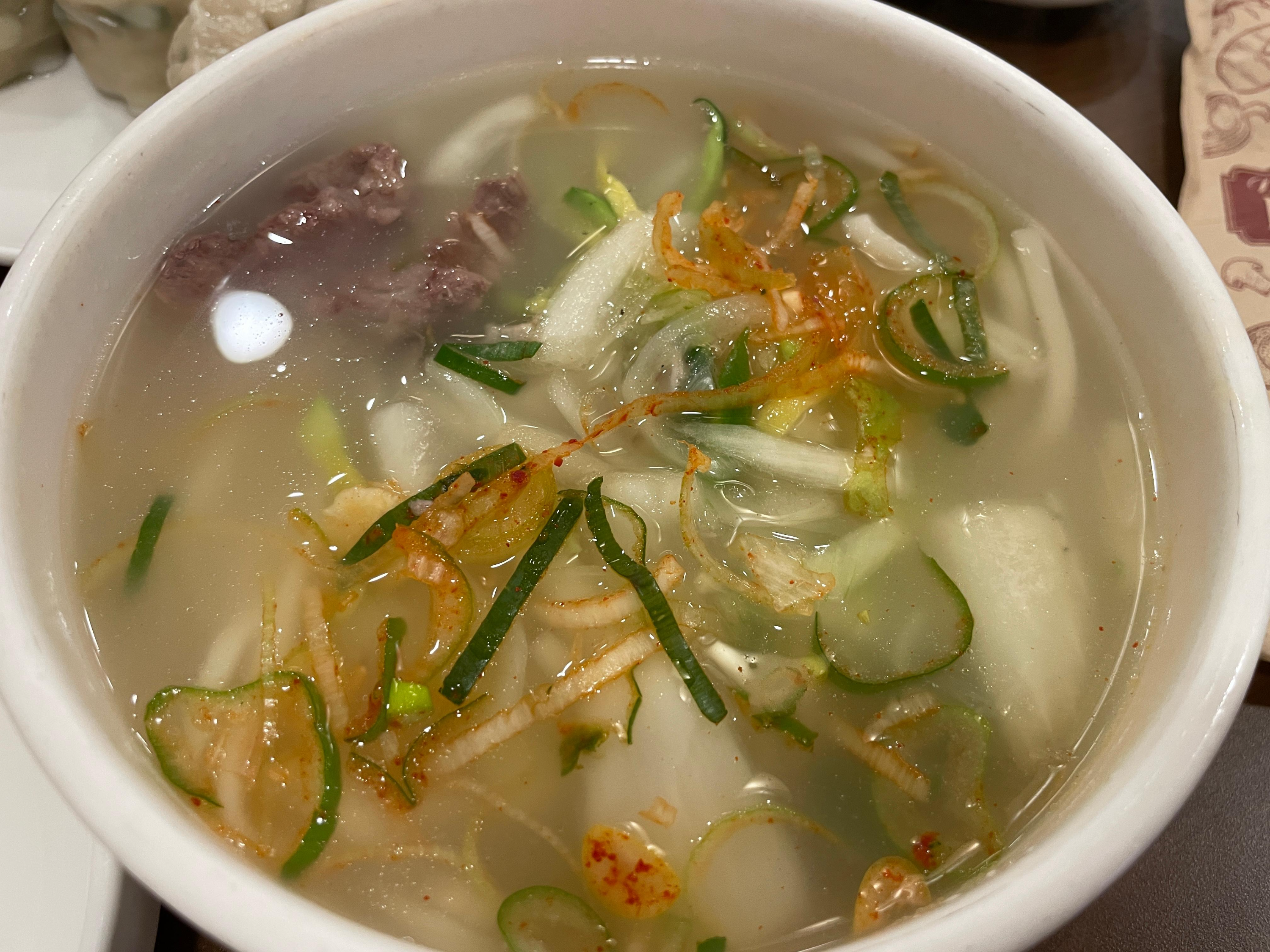 곧 이어 나온 칼국수는 사골베이스에 중면 2배만한 면에 고기와 약간의 고명이 올라가 있어요. 국물이 적당히 깊고 간이 딱 맞는게 누구나 잘 먹을만한 맛이더라고요. 매일먹어도 질리지 않을만한 자극0인 음식이에요.