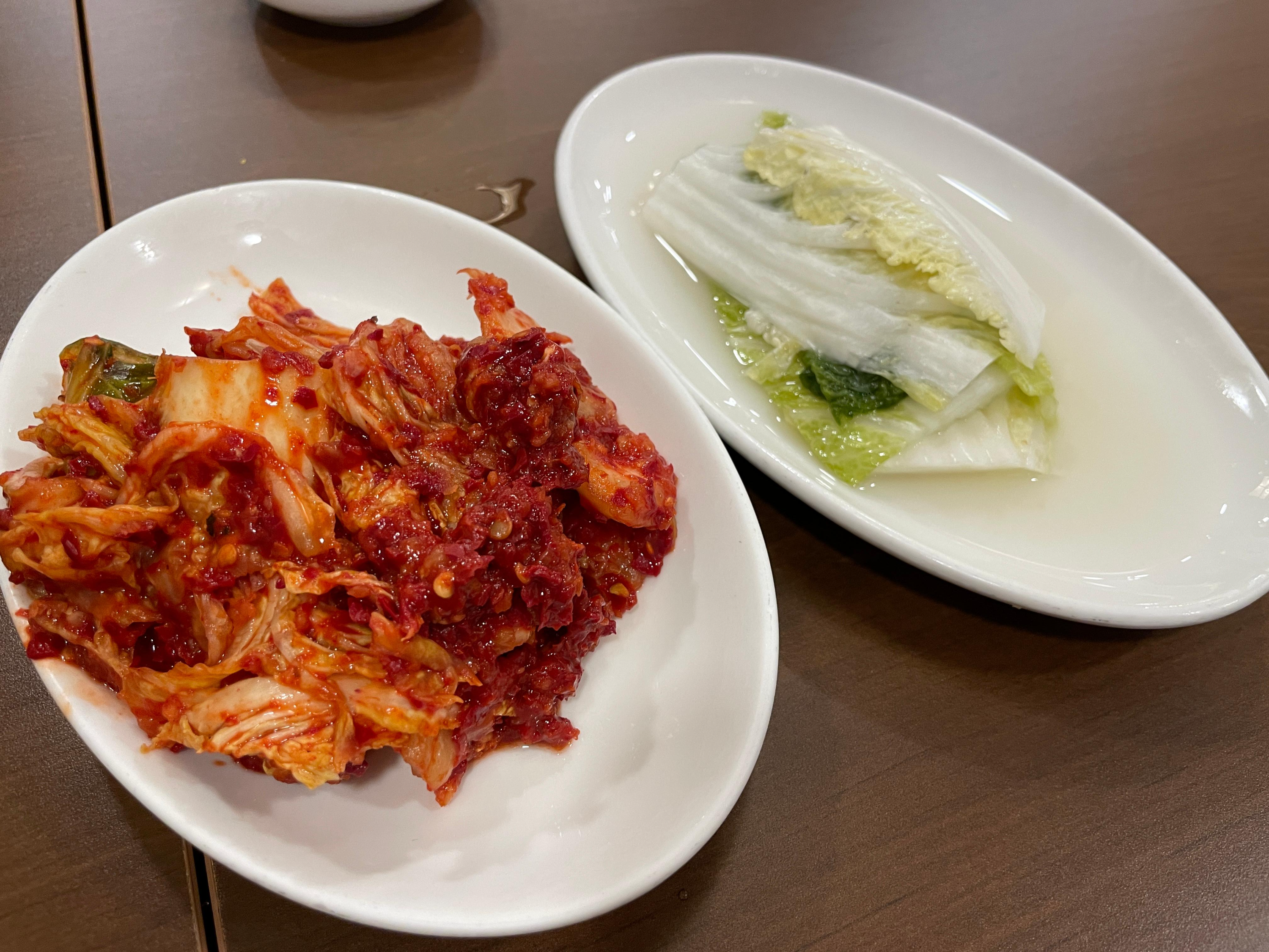 빨간 김치는 명동교자랑 비슷한 마늘맛 강하면서 매콤하지만 맛있는 겉절이 느낌이고 백김치는 남녀노소 다 잘먹을만한 맛이에요.