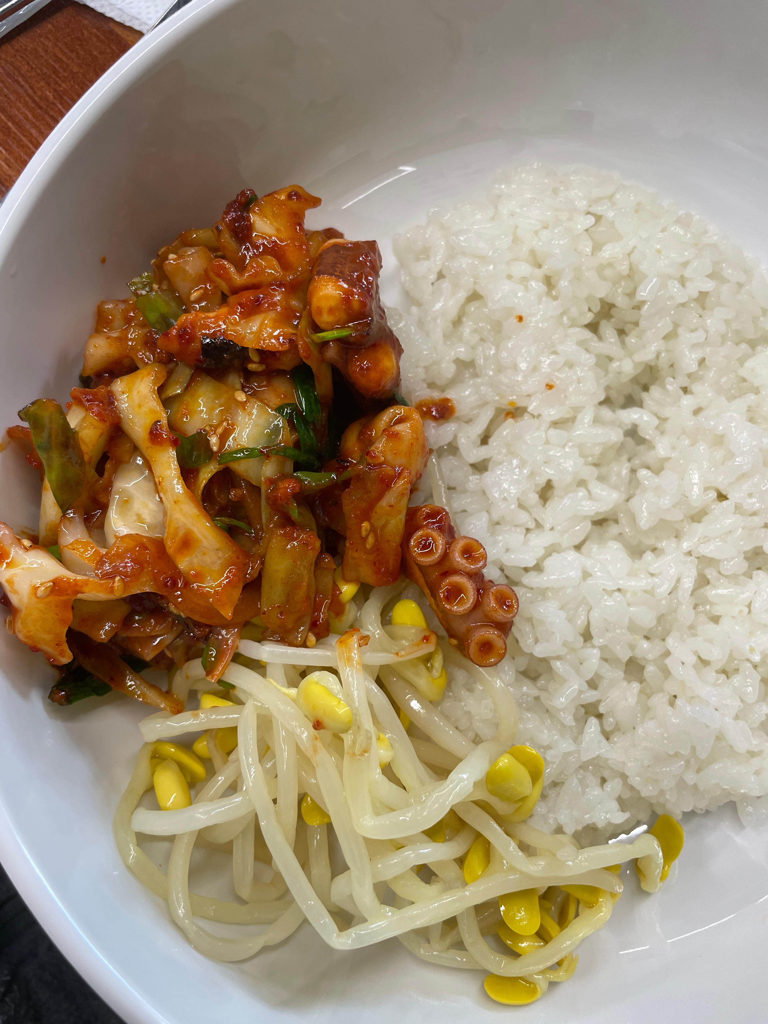 밥에 낙지볶음과 콩나물을 넣고 싹싹 비벼 먹으니 한그릇 뚝딱합니다. 낙지 볶음 오랜만에 먹어보는데 맛있네요.