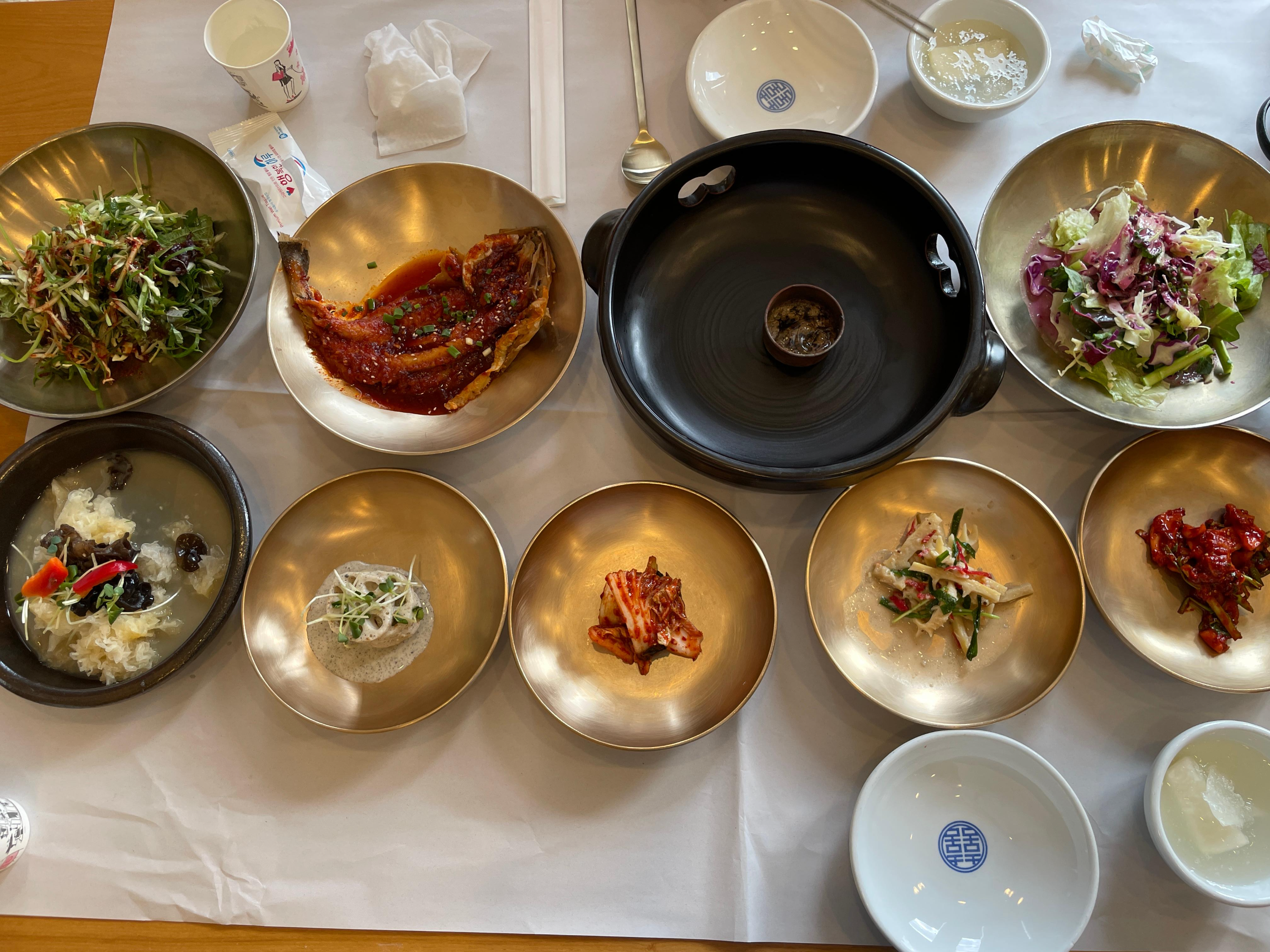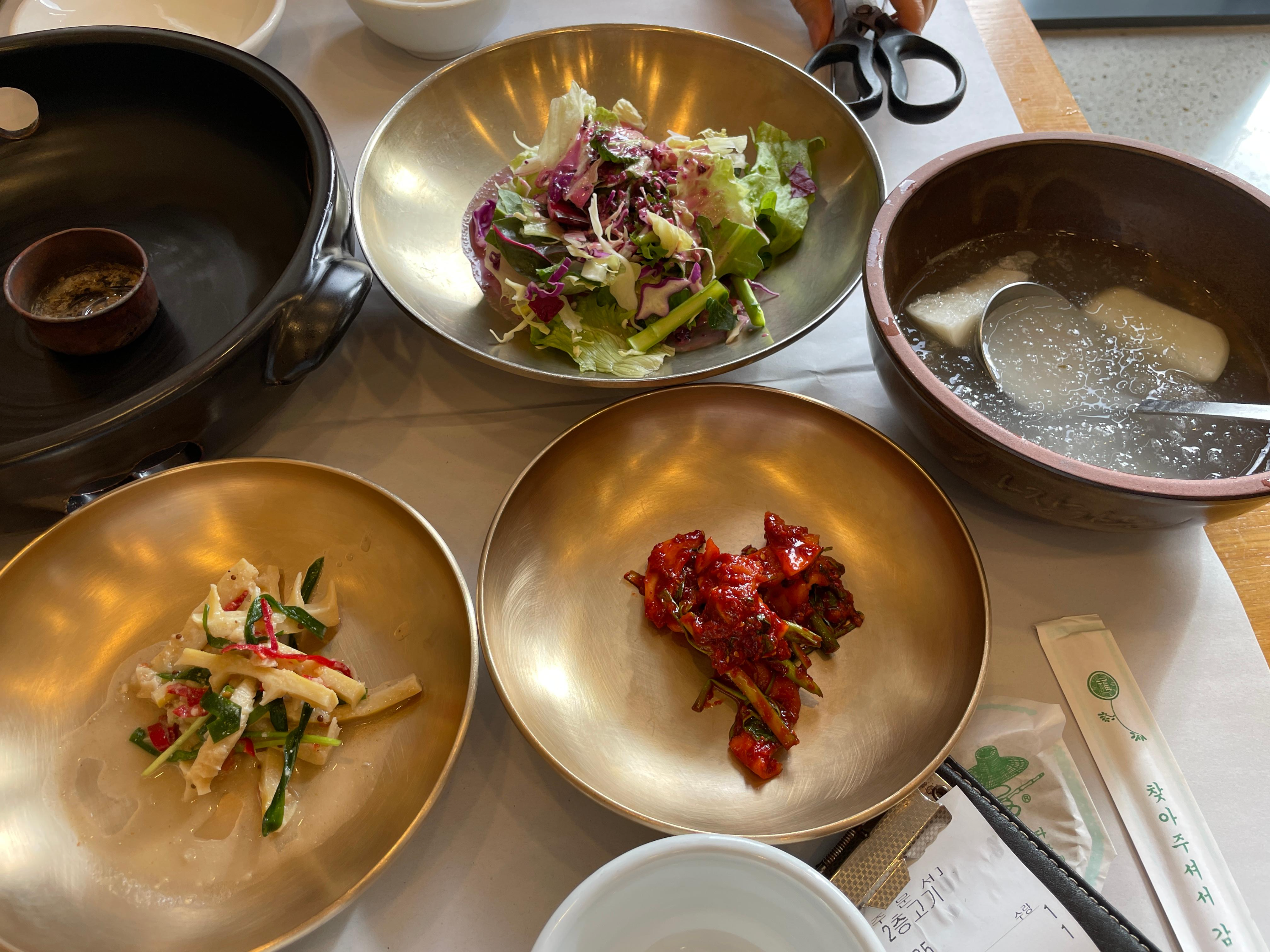두명이서 원조랑 매운맛 각 1인분씩 주문했어요. 기다리는 동안 놋그릇에 반찬이 담겨나오는데 왜 인기있는 곳인지 알겠더라고요. 파무침, 버섯냉채, 연근샐러드, 양념 북어 등이 나오는데 다 맛있어요.