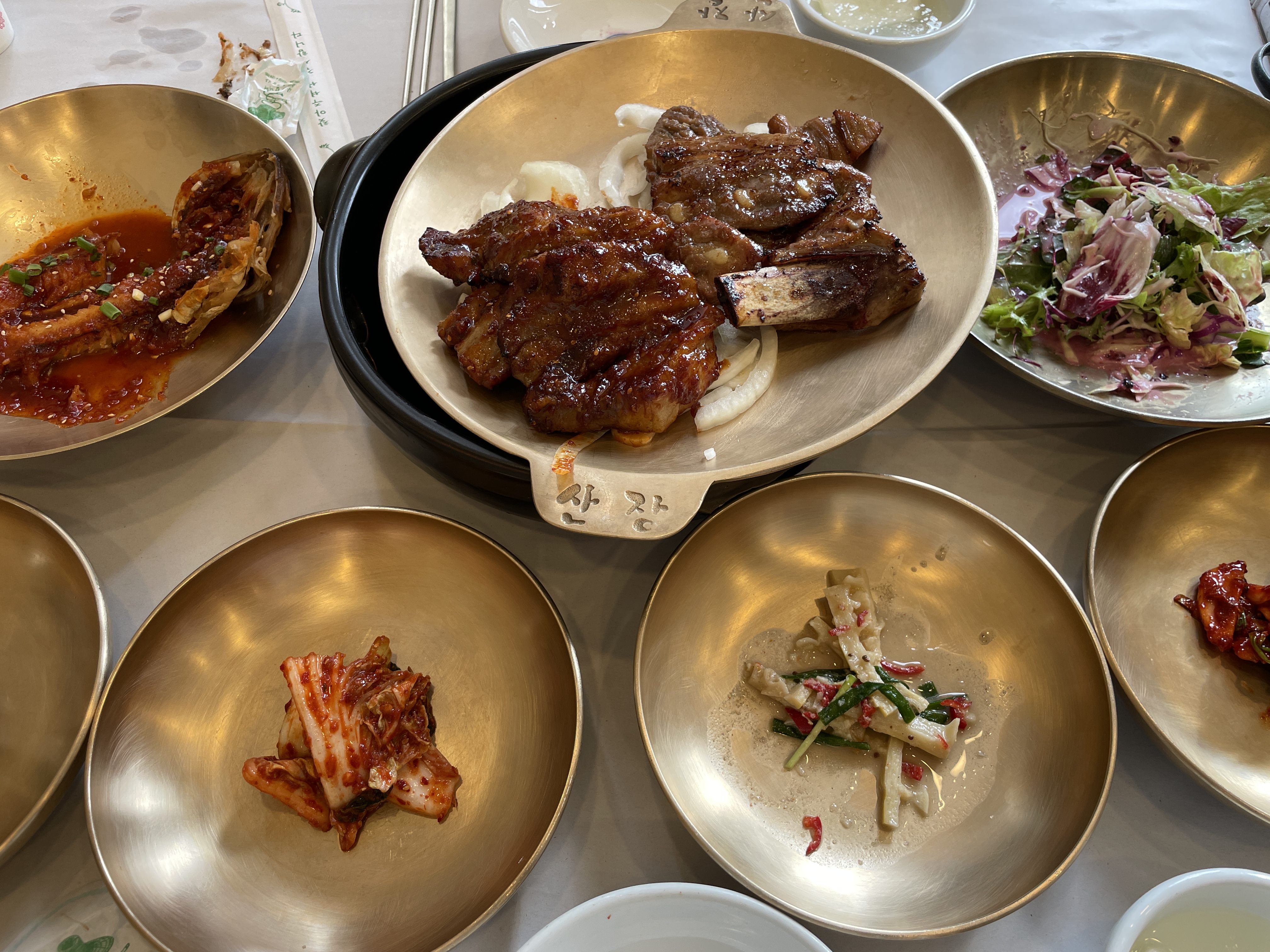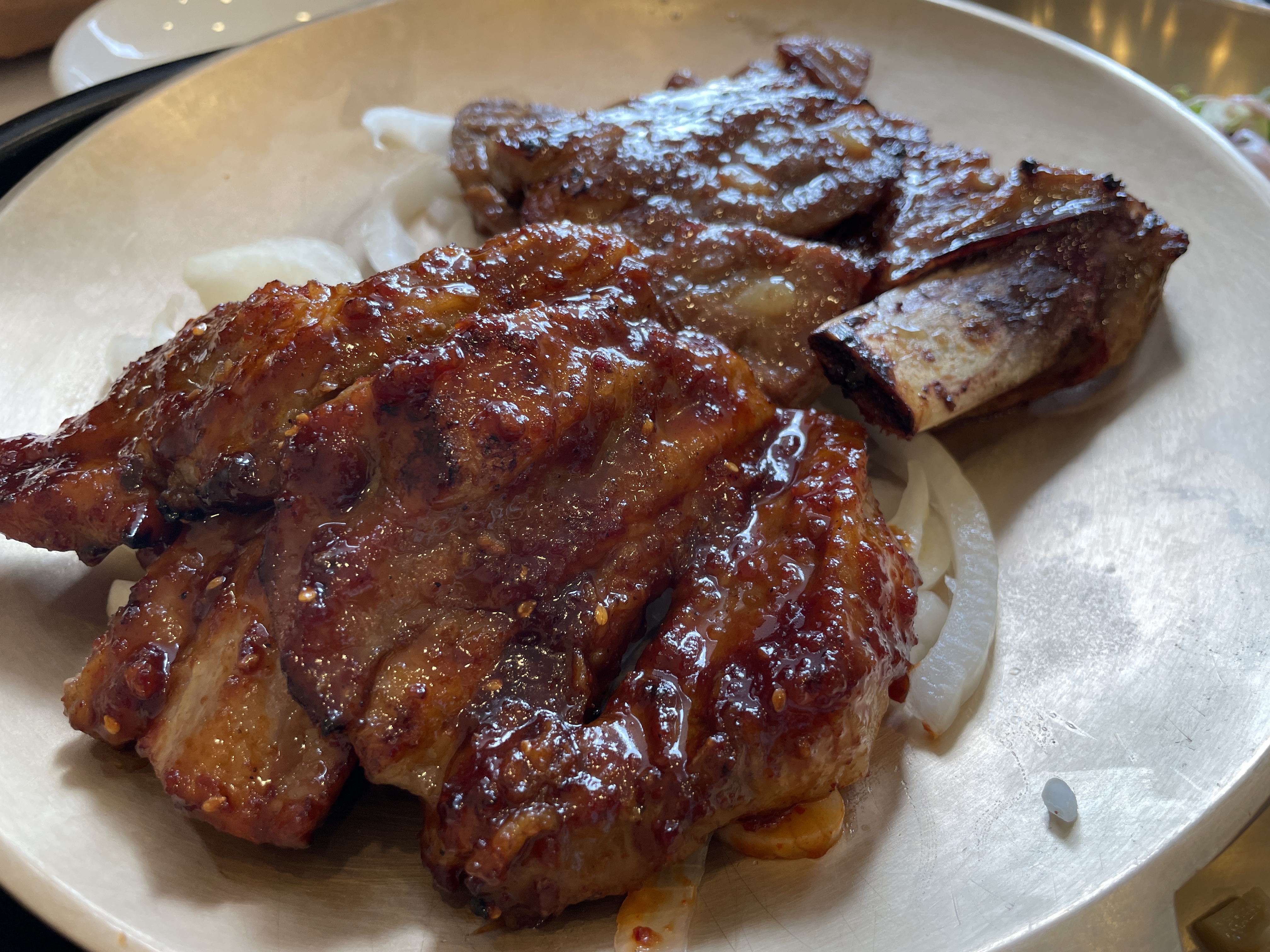 드디어 나온 산장가든 갈비입니다. 매운맛은 살짝 매콤한 정도라 자극적이지 않고 원조는 우리가 생각하는 그 맛인데 다 구워져 나오고 적당히 잘 구워져서 맛있었어요.