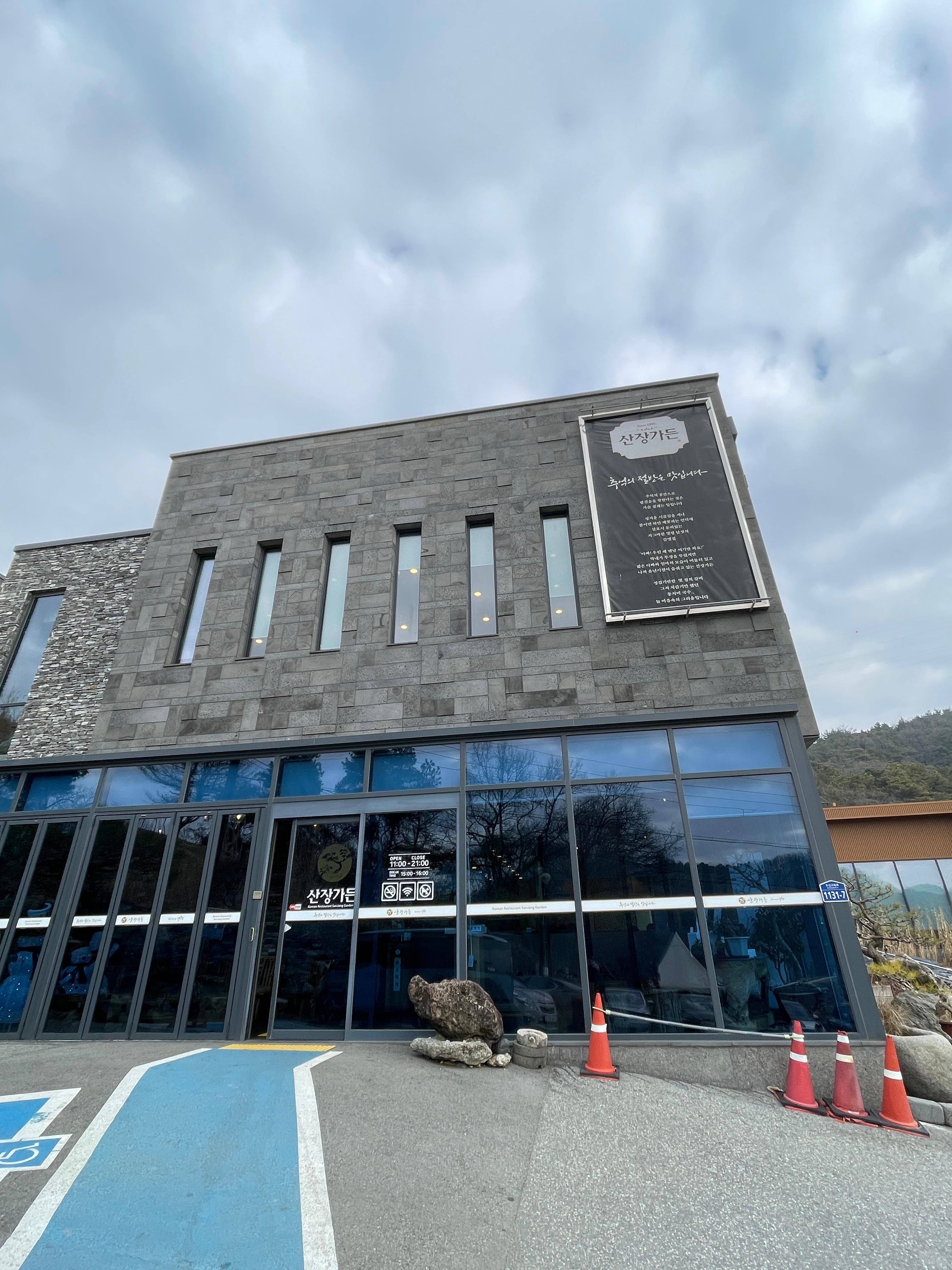 고복 저수지를 둘러싸고 카페와 식당 등이 좀 있는데 산장가든이 가장 잘 되는 것 같았어요. 일단 뜬금없는 자리에 큰 규모의 새 건물이었고, 주차장 크기가 매우 컸어요.