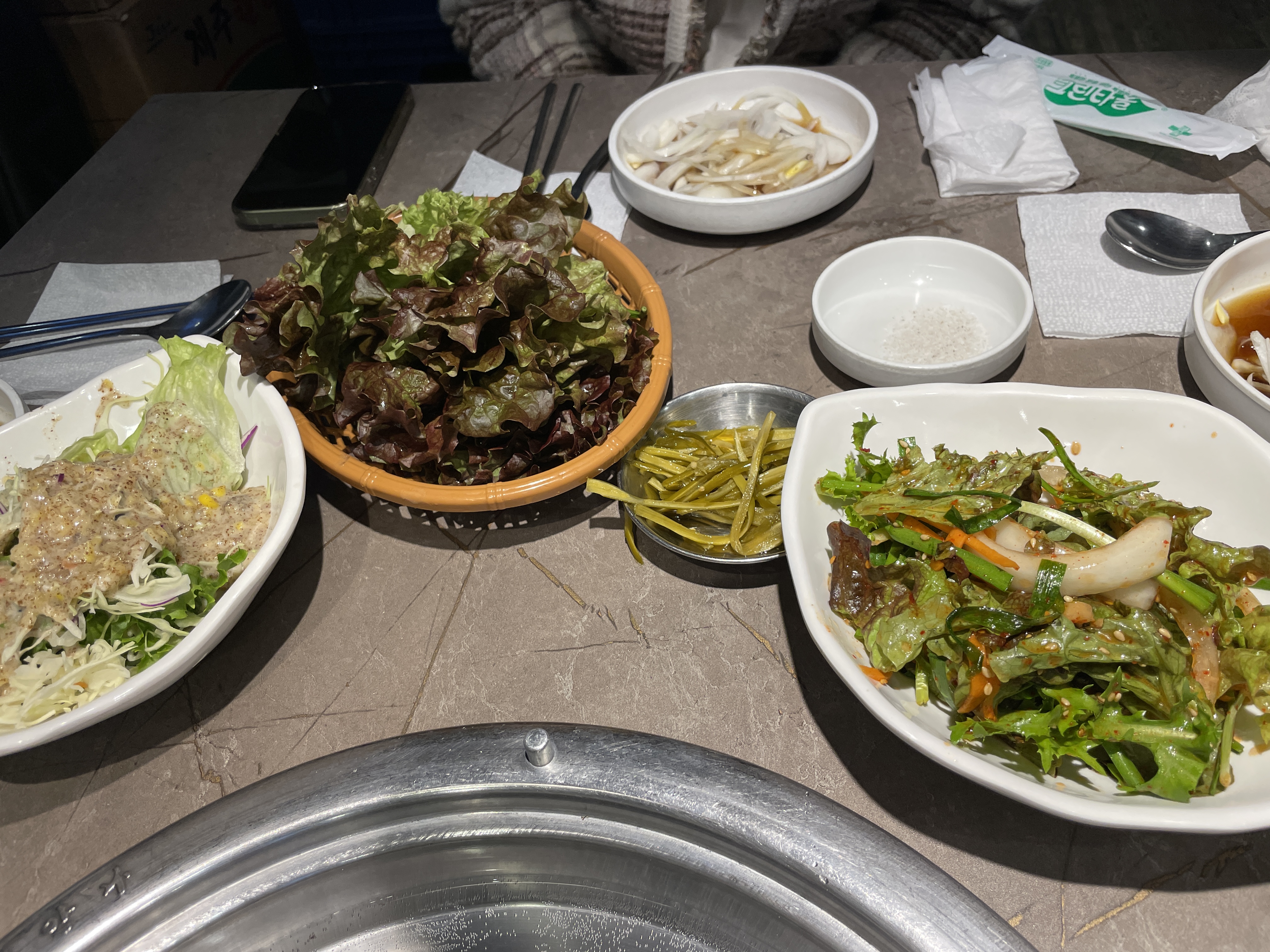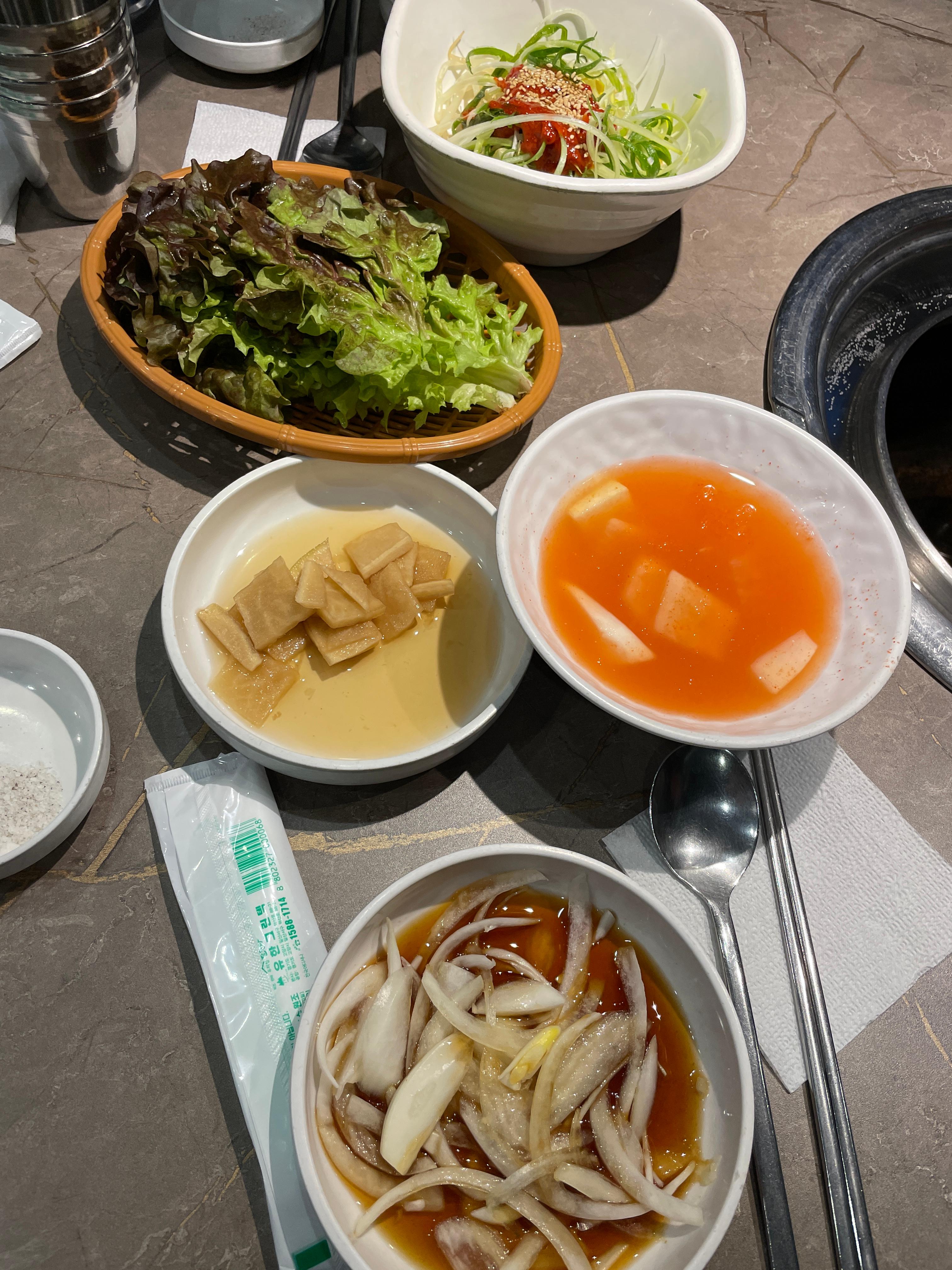 밑반찬은 샐러드, 쌈채소, 풀채소무침, 파무침 등이 나왔어요. 다 맛있었고 셀프코너에서 떠다 먹을 수 있었어요.