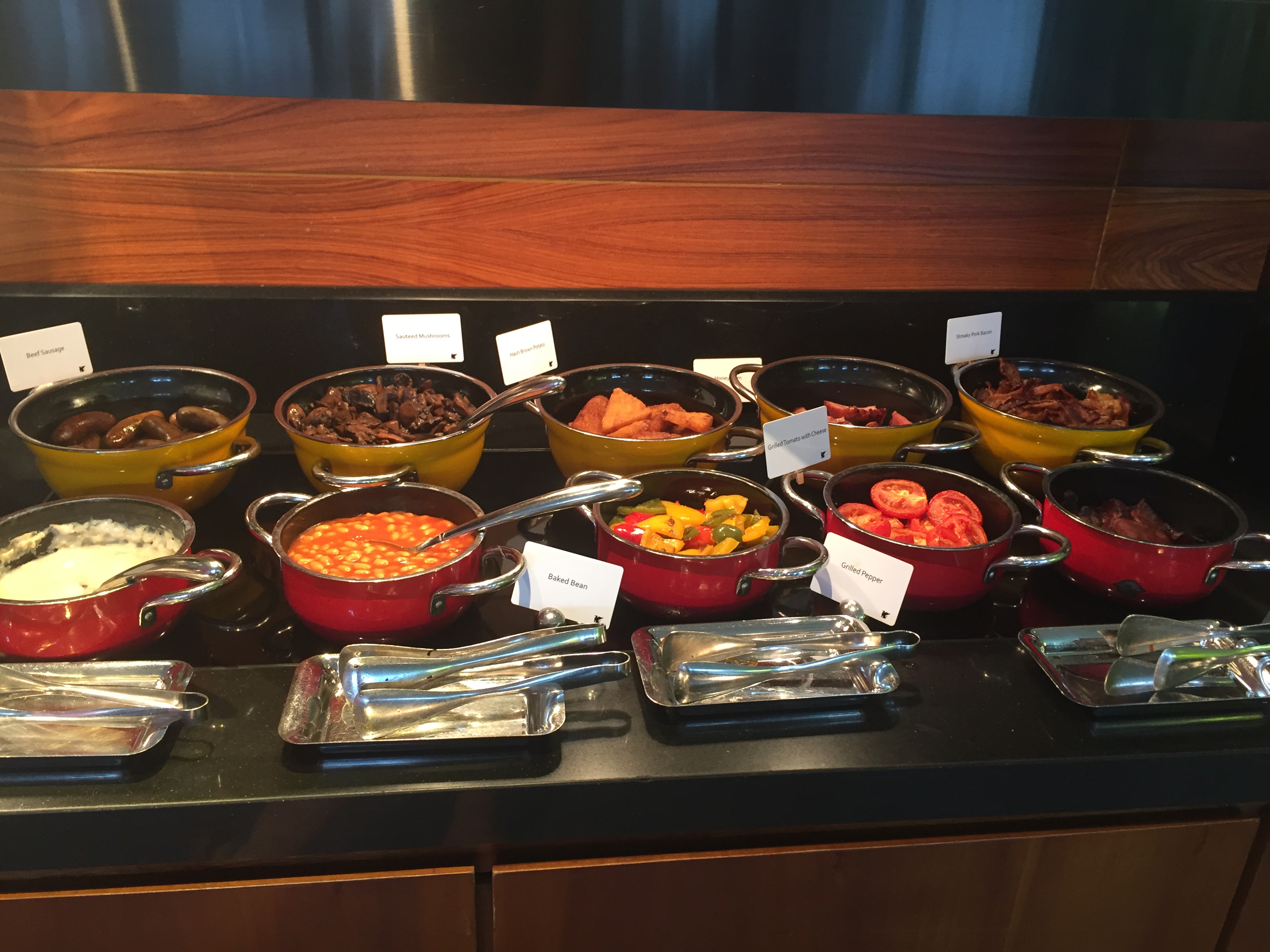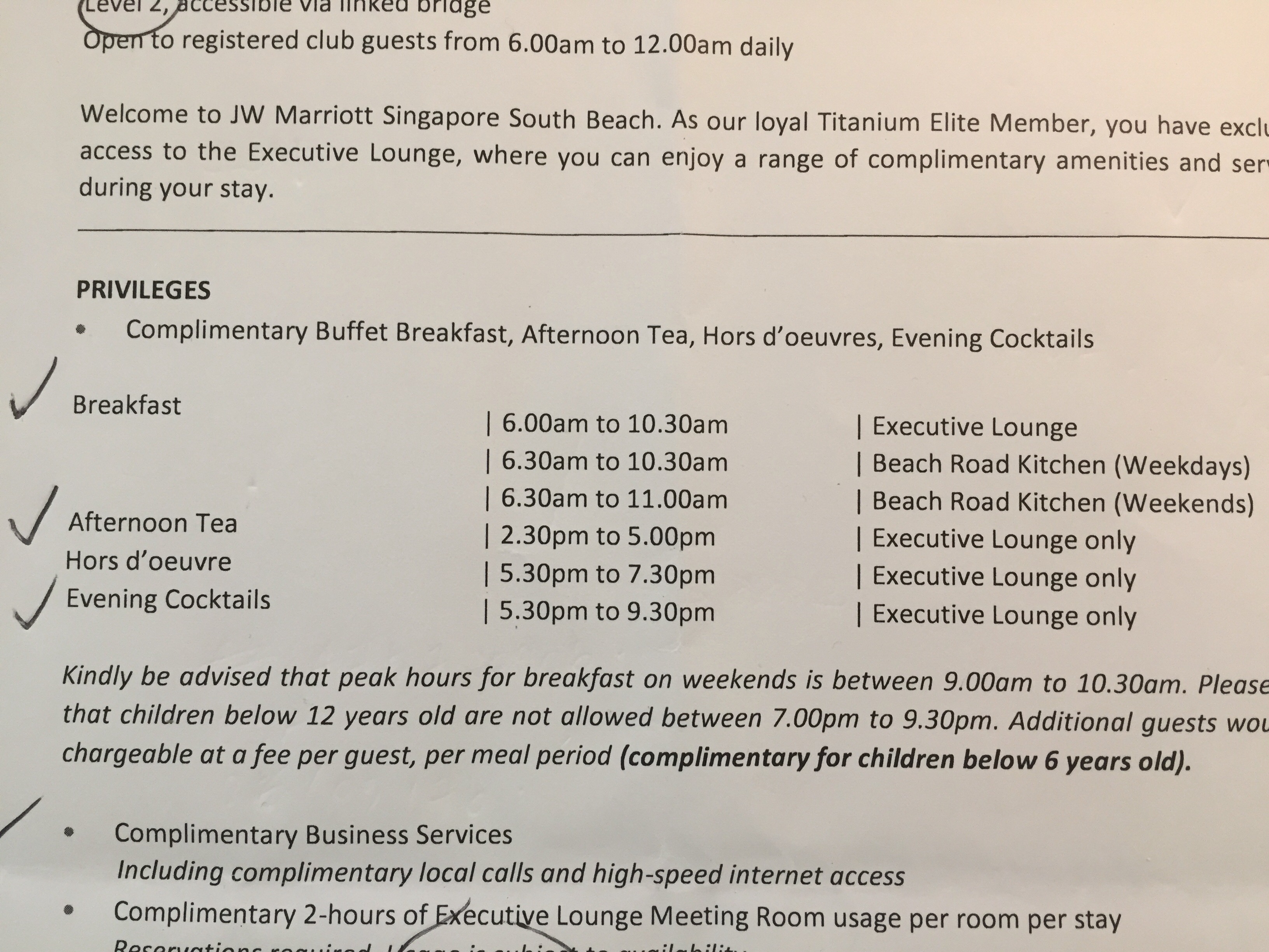 Premier Marina Bay Suite Executive lounge access 방이어서 이그제큐티브 라운지 이용이 가능한데요. 다음 사진에 있는 시간대에 맞춰 가야 먹을 것이 좀 있어요. 아침은 비치로드치킨과 라운지 중에 고를 수 있어요.