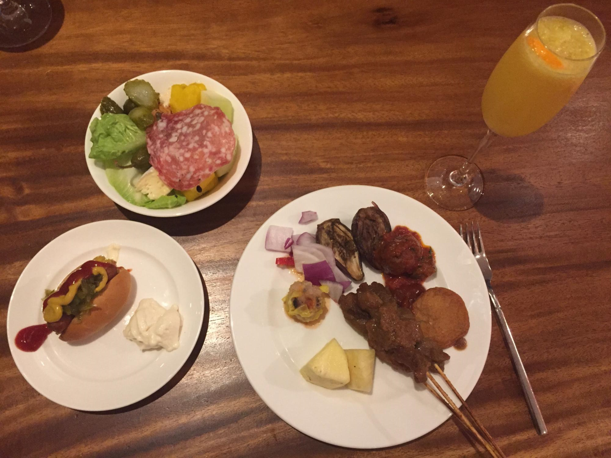 저녁에 가니 핫도그, 샐러드 채소, 안주가 될만한 사태, 미트볼 등이 있었어요. 주문가능한 칵테일도 있으니 안쪽 바에 들어가서 주문해보세요. 거기 냉장고에서 물, 탄산수, 탄산음료 등 가져다 먹을 수 있어요. 김스낵도 그냥 가져가라고 바구니에 놓여 있는데 아주 맛있게 먹고 태국에서 몇번을 더 사먹었어요. 금방 없어져서 아쉬운데 그만큼 당기는 맛이에요.