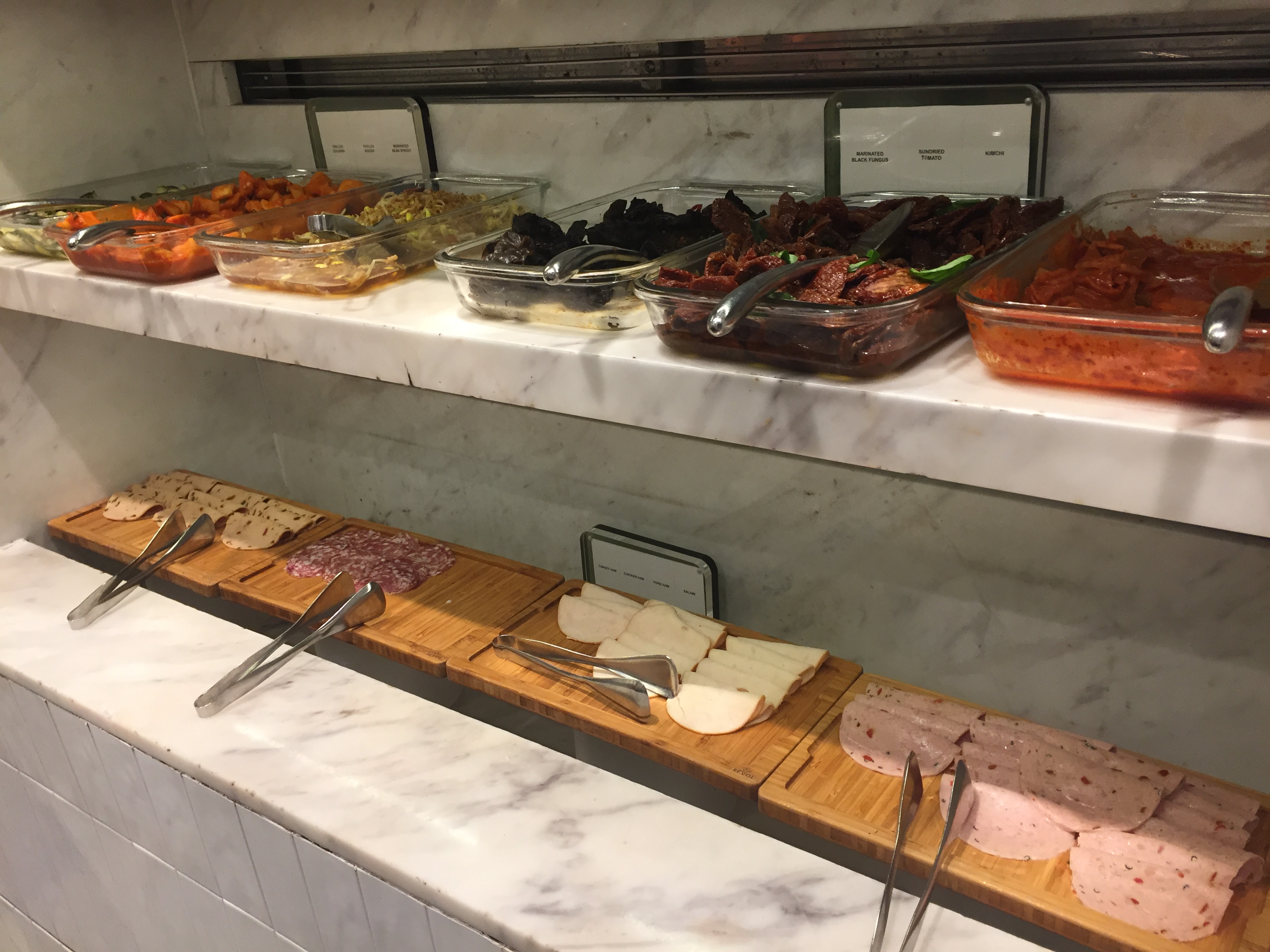 채소 종류도 매우 다양하게 있어요. 맨 위에 있는것은 피클류인데 뚜껑 여닫는게 귀찮아서 패스했습니다.