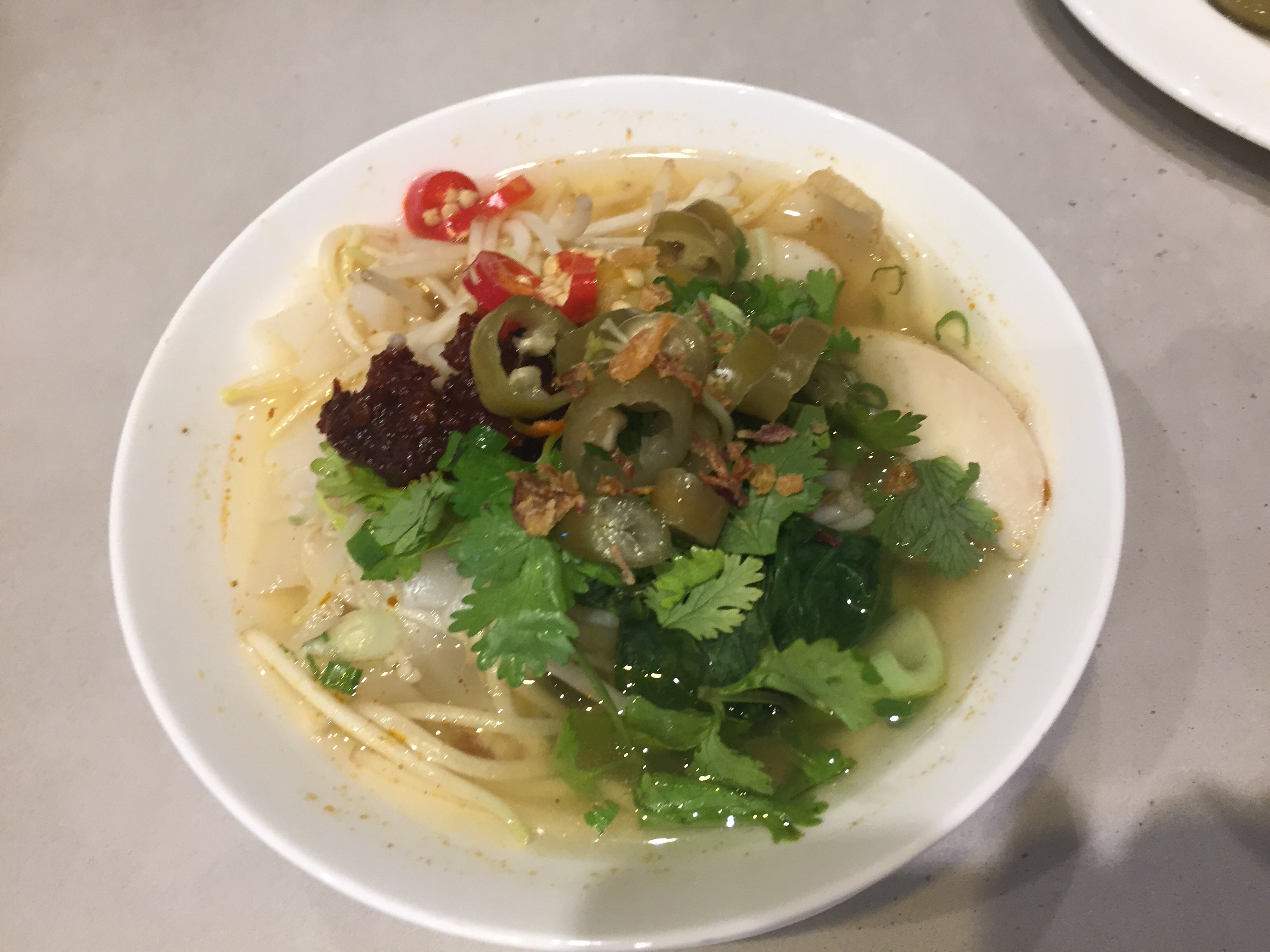 조금만 기다리면 짜잔 나옵니다. 다양한 양념장과 고명이 준비되어 있는데 동남아니까 고수, 고추, 칠리소스 팍팍 얹어봅니다.