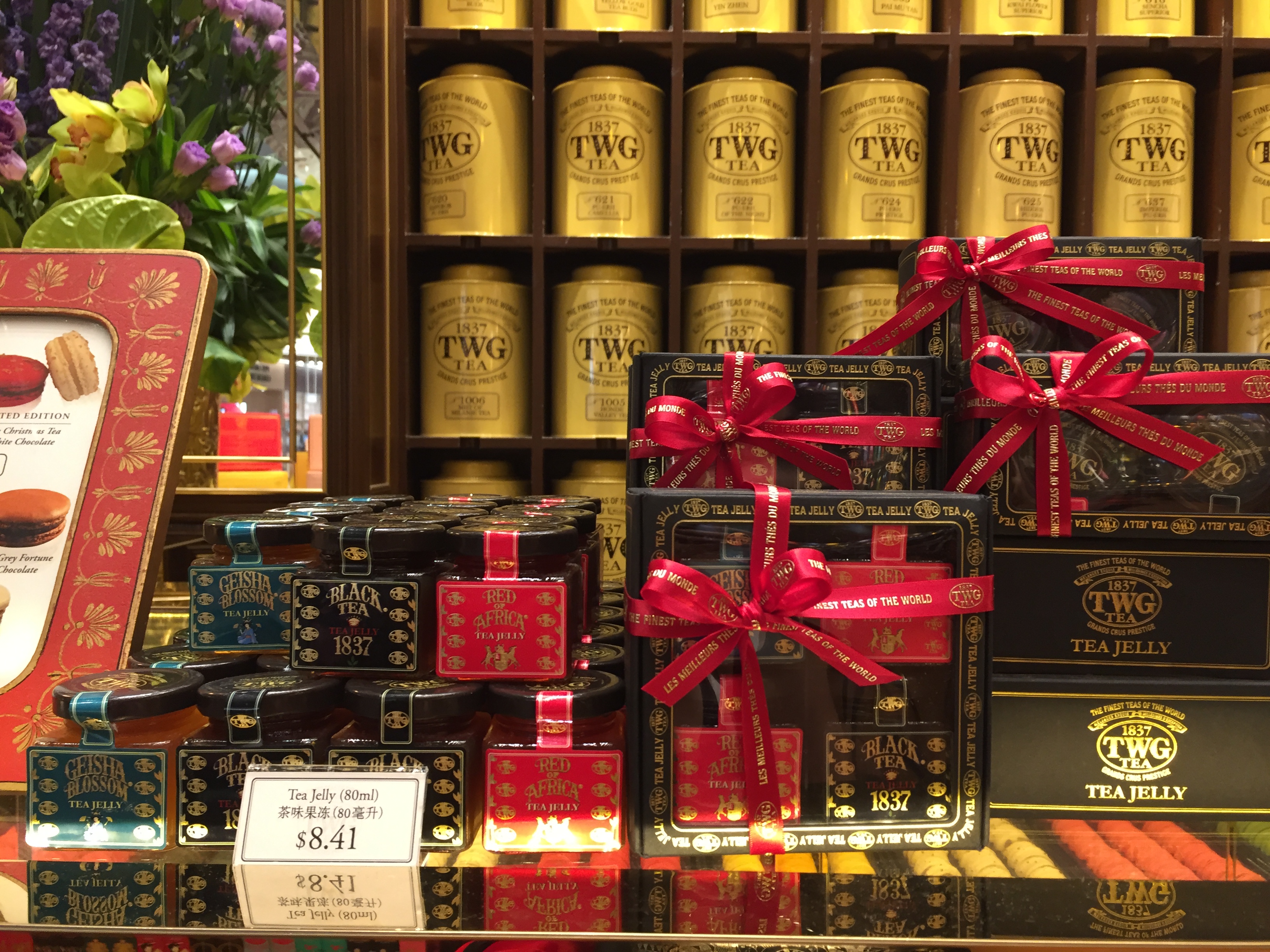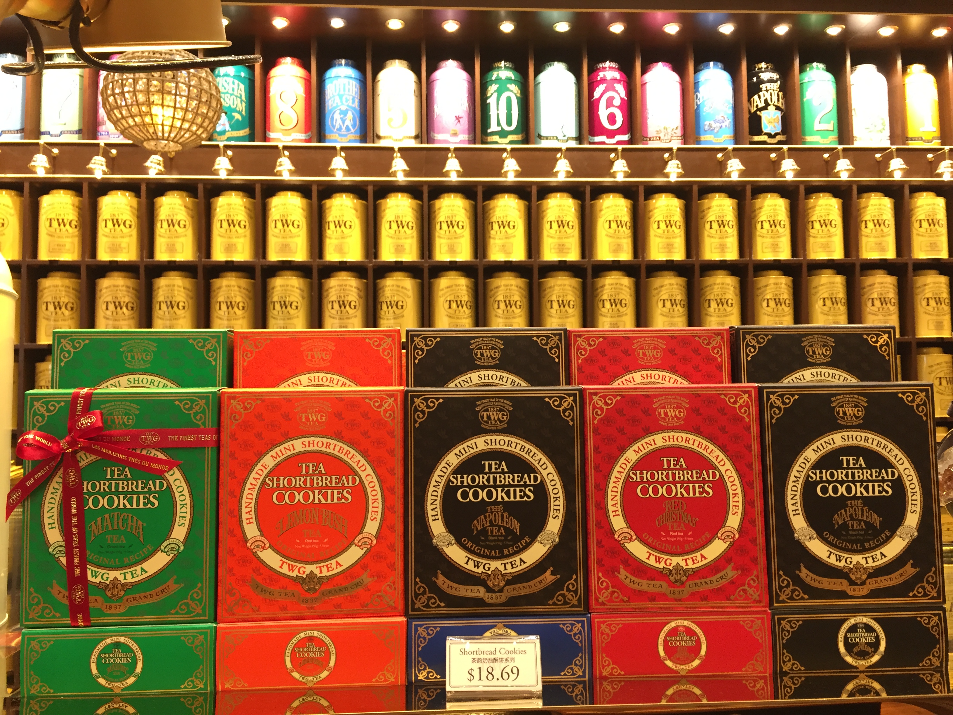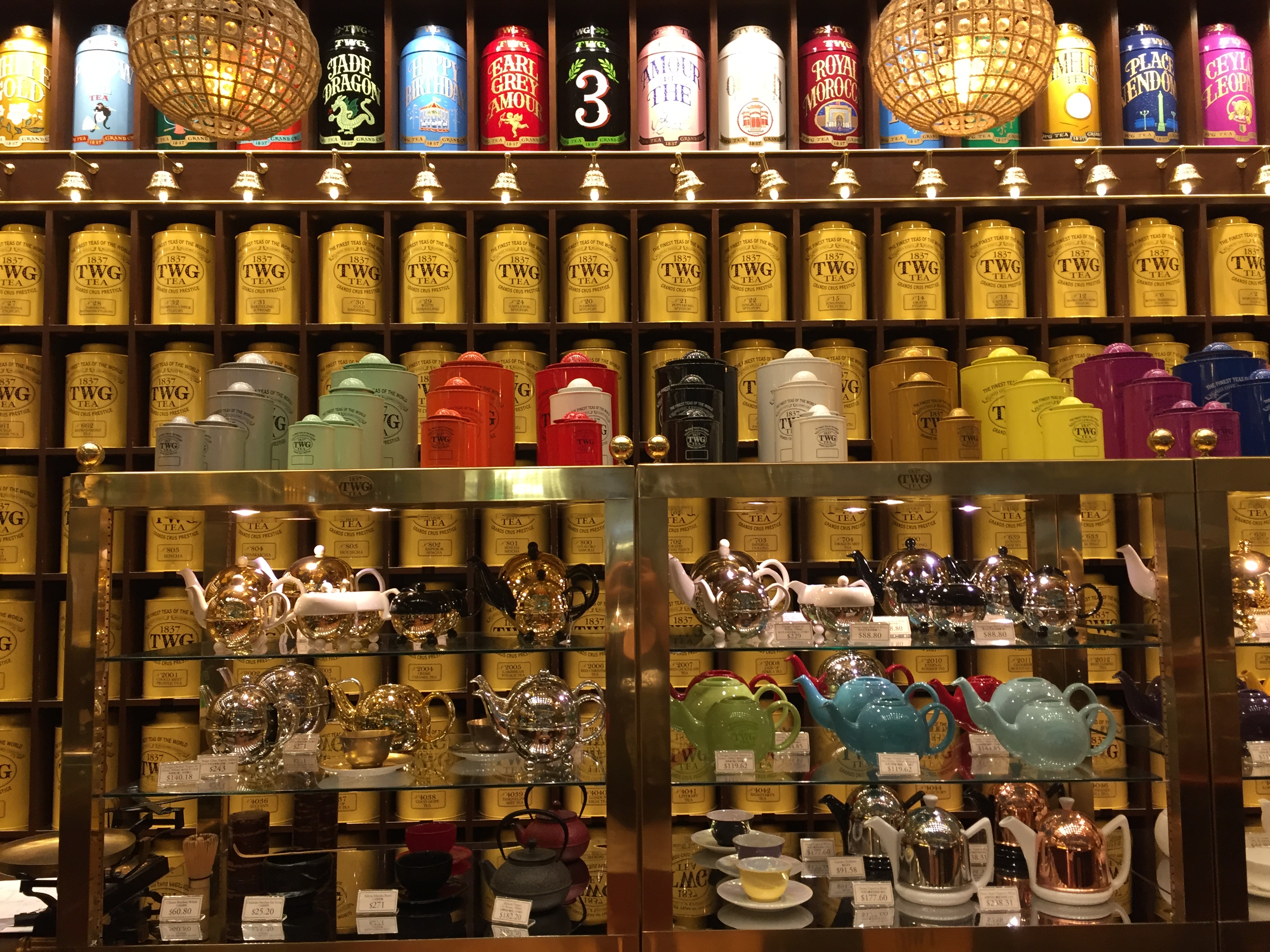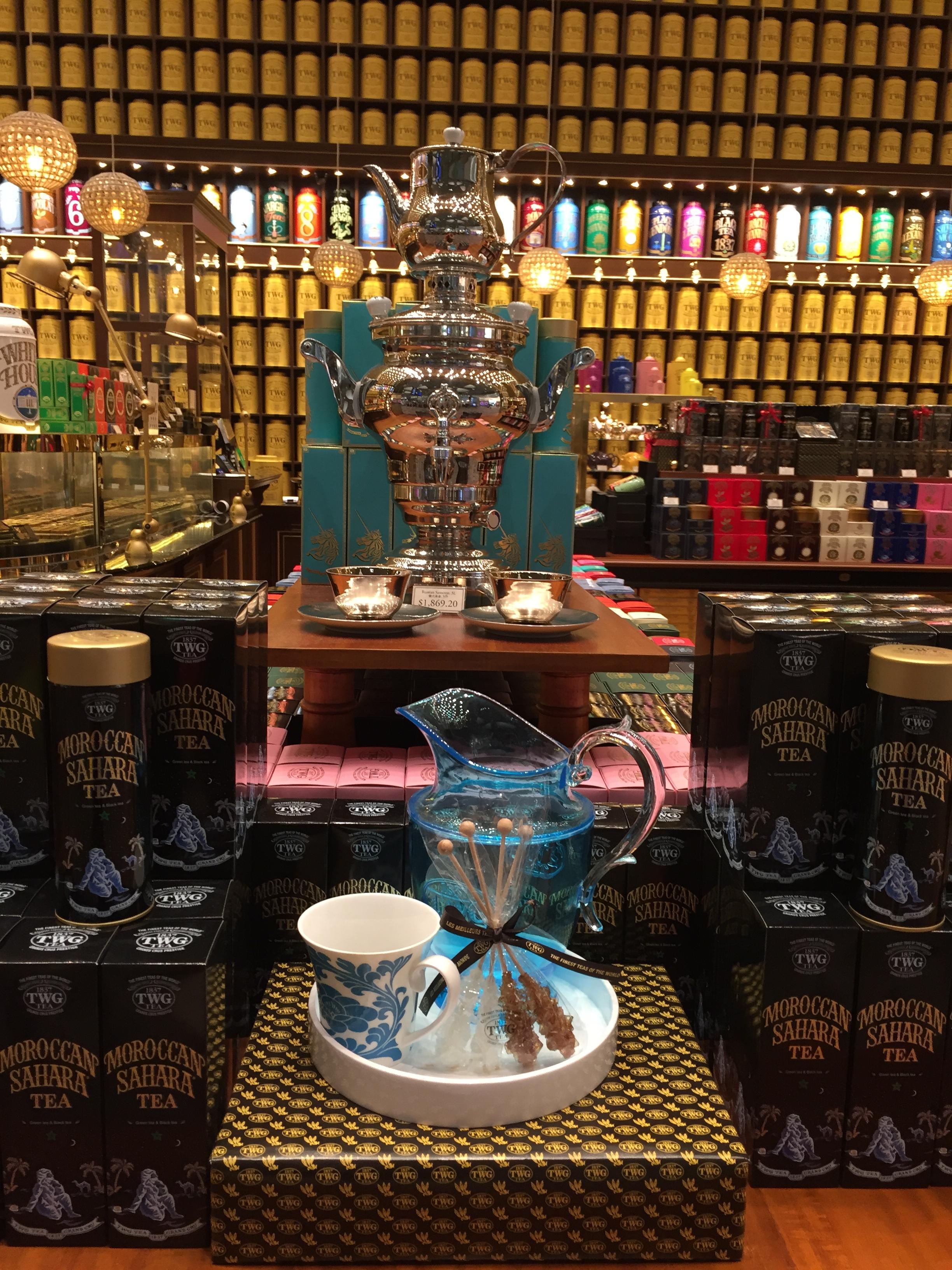 티팟세트도 판매하고 있고요. 다양한 크기와 색의 틴트가 엄청 많이 있어요. 뒤에 벽에 있는 틴트는 소분판매하는 티가 담겨져 있어 적절한 가격으로 TWG 차를 즐길 수 있답니다.