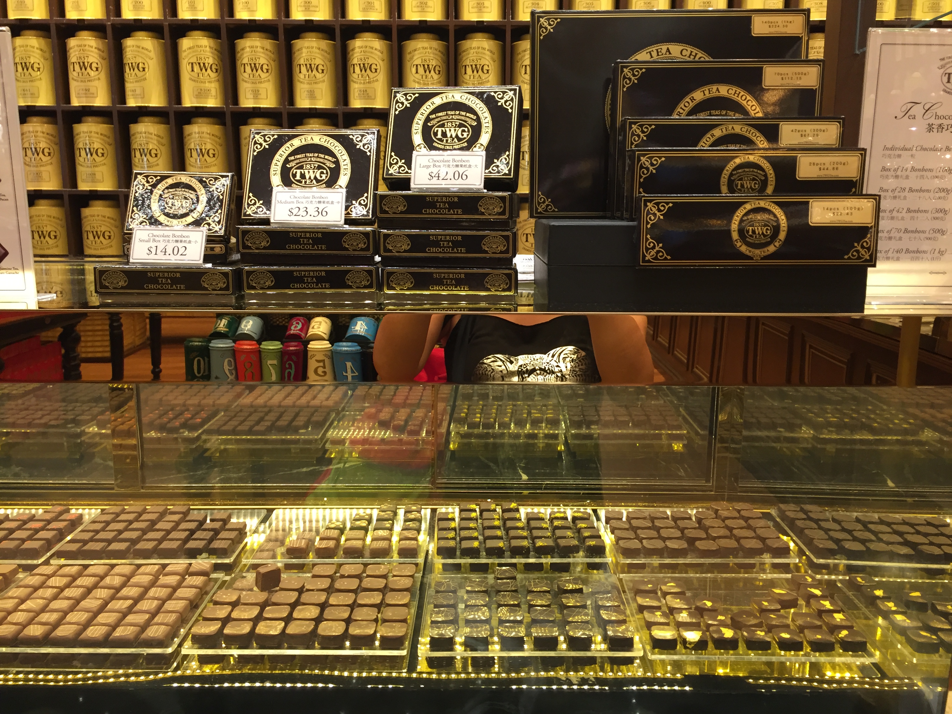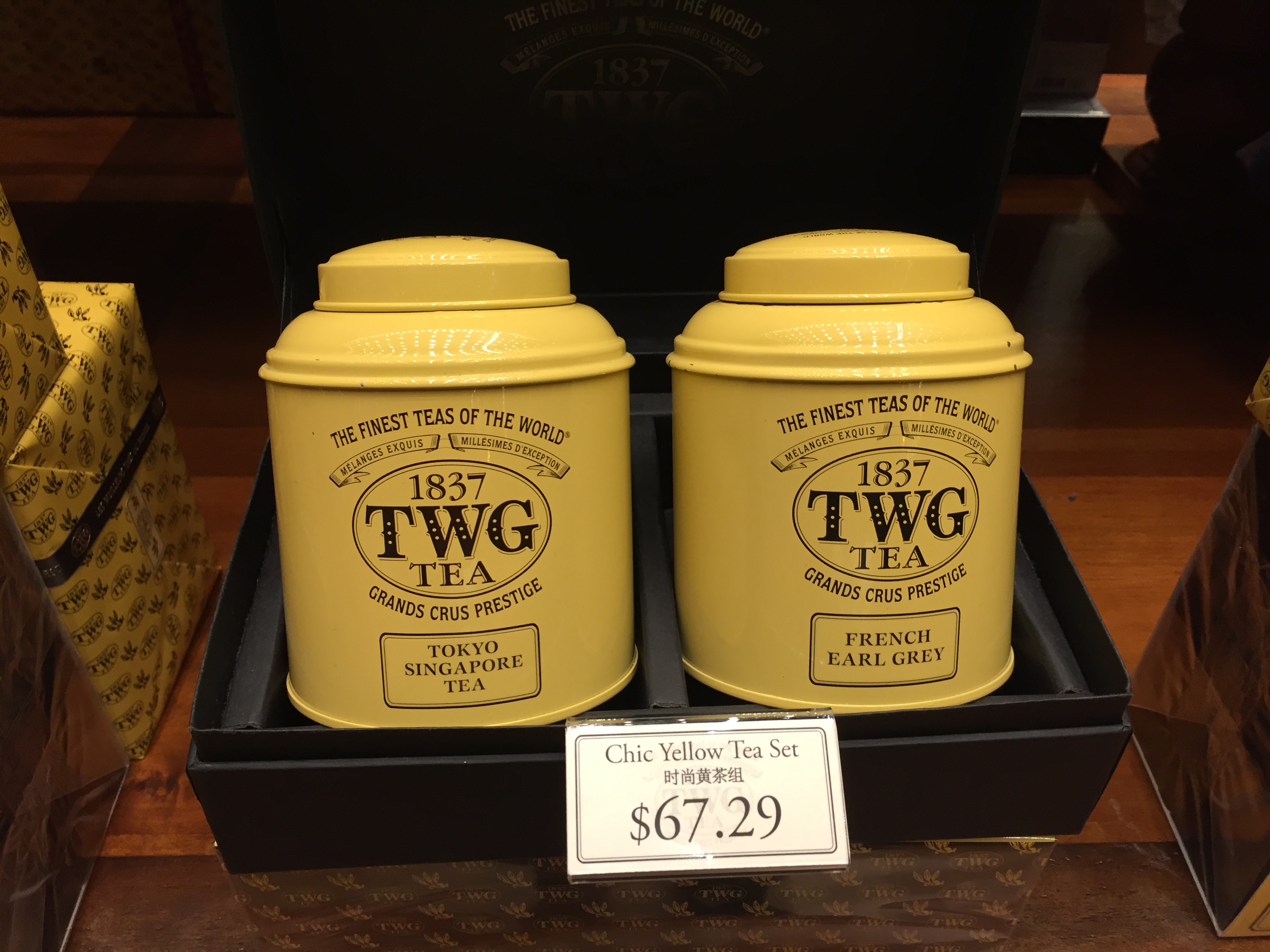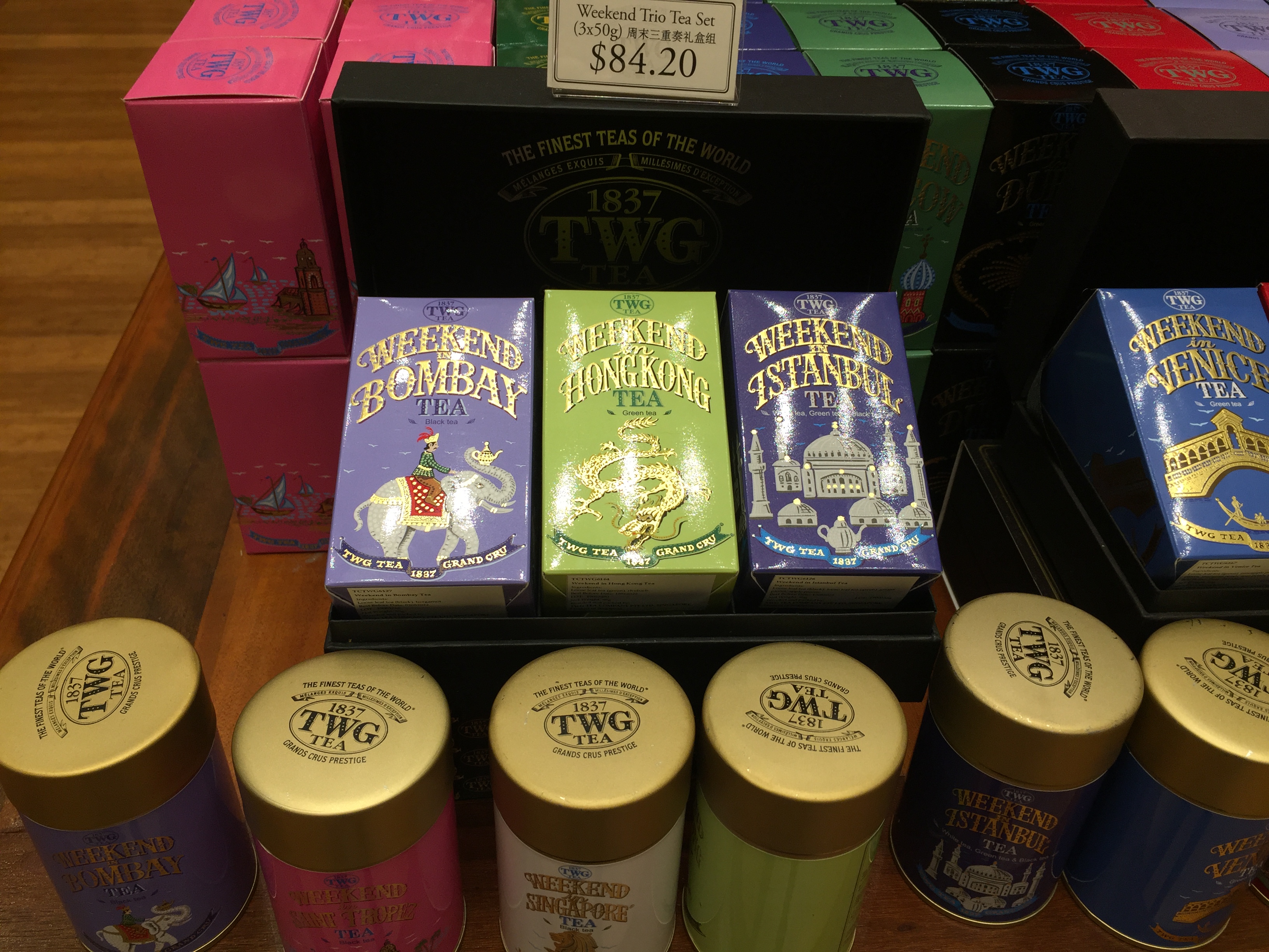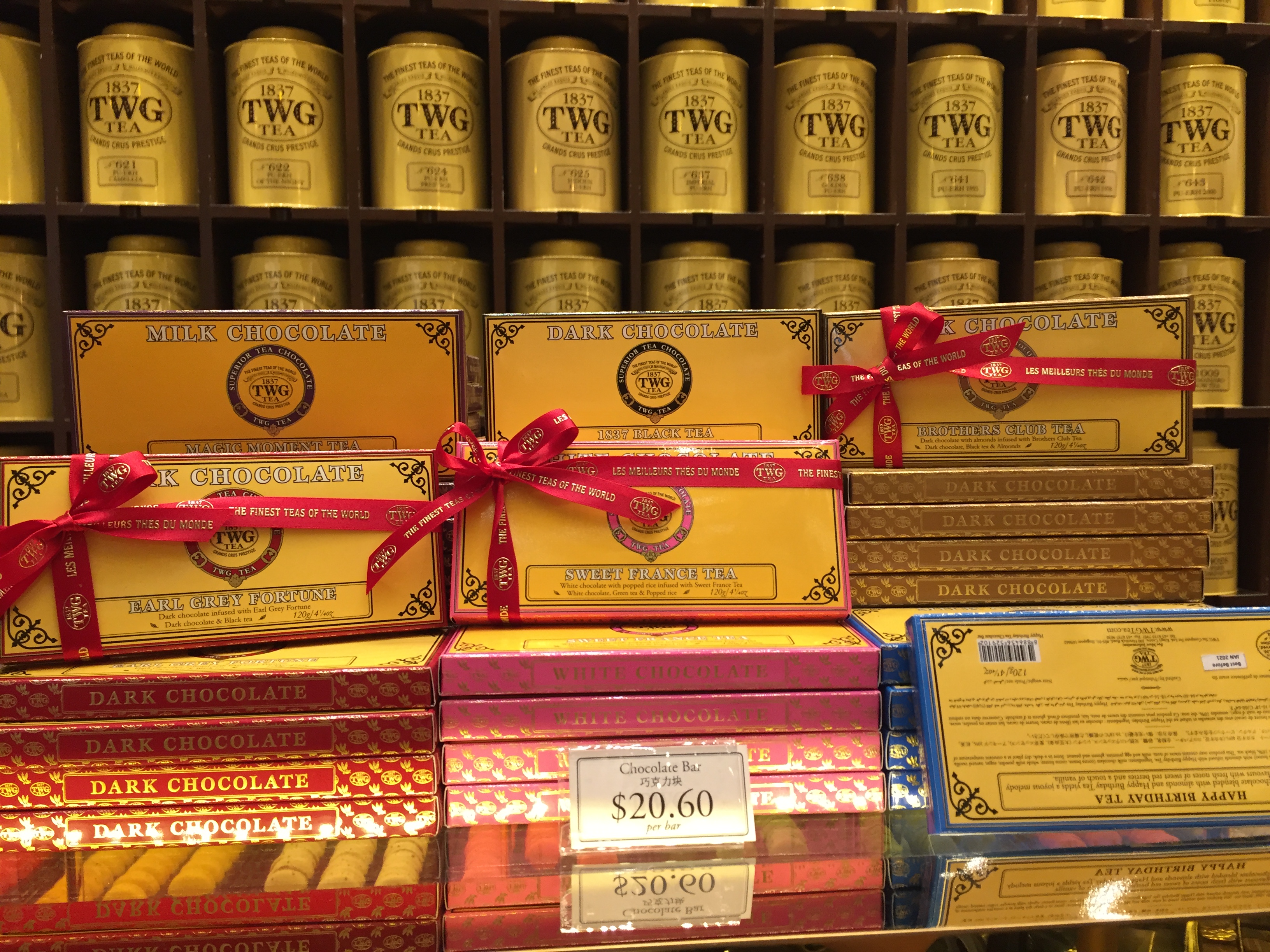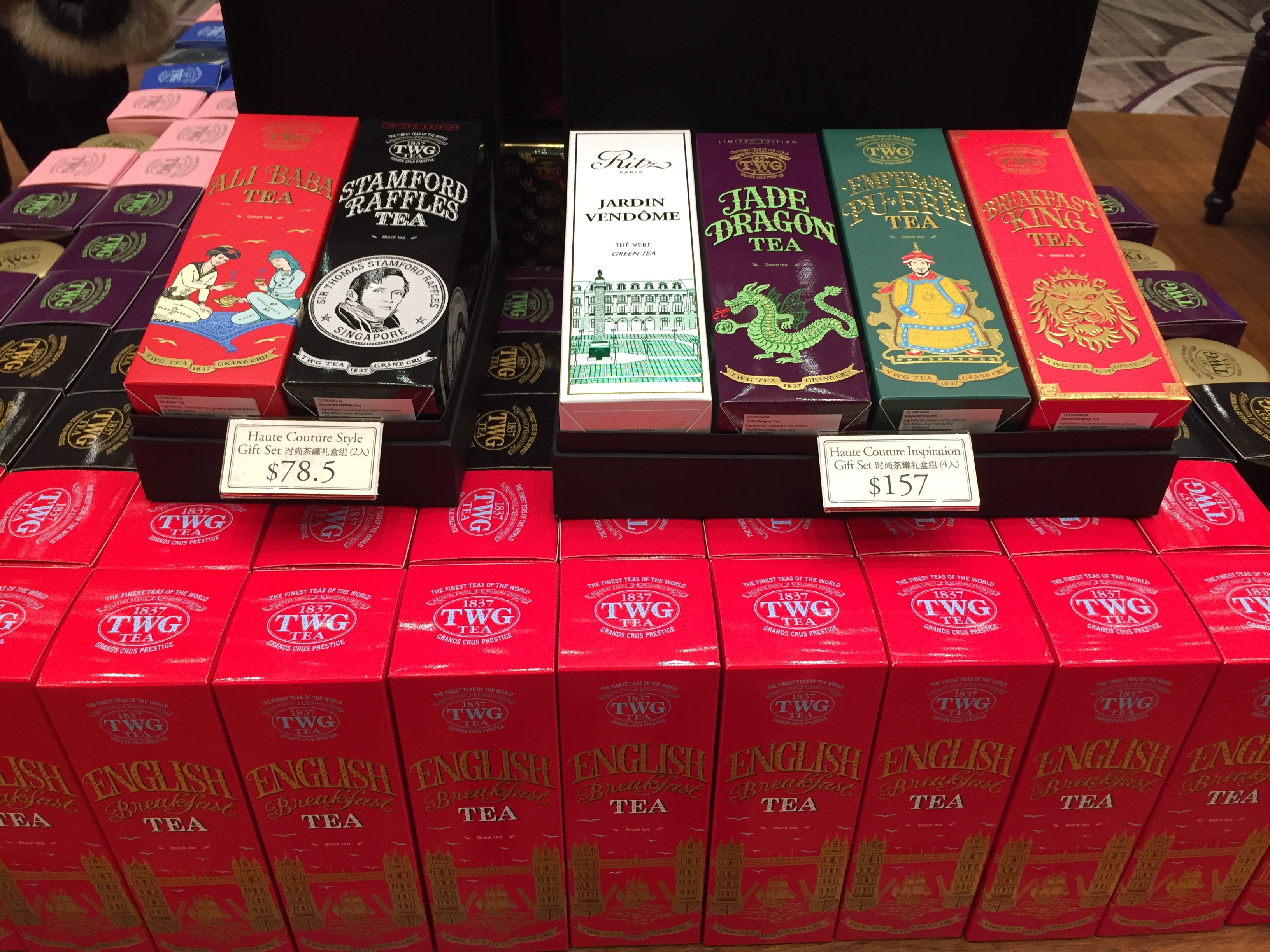 티팟세트도 판매하고 있고요. 다양한 크기와 색의 틴트가 엄청 많이 있어요. 뒤에 벽에 있는 틴트는 소분판매하는 티가 담겨져 있어 적절한 가격으로 TWG 차를 즐길 수 있답니다.