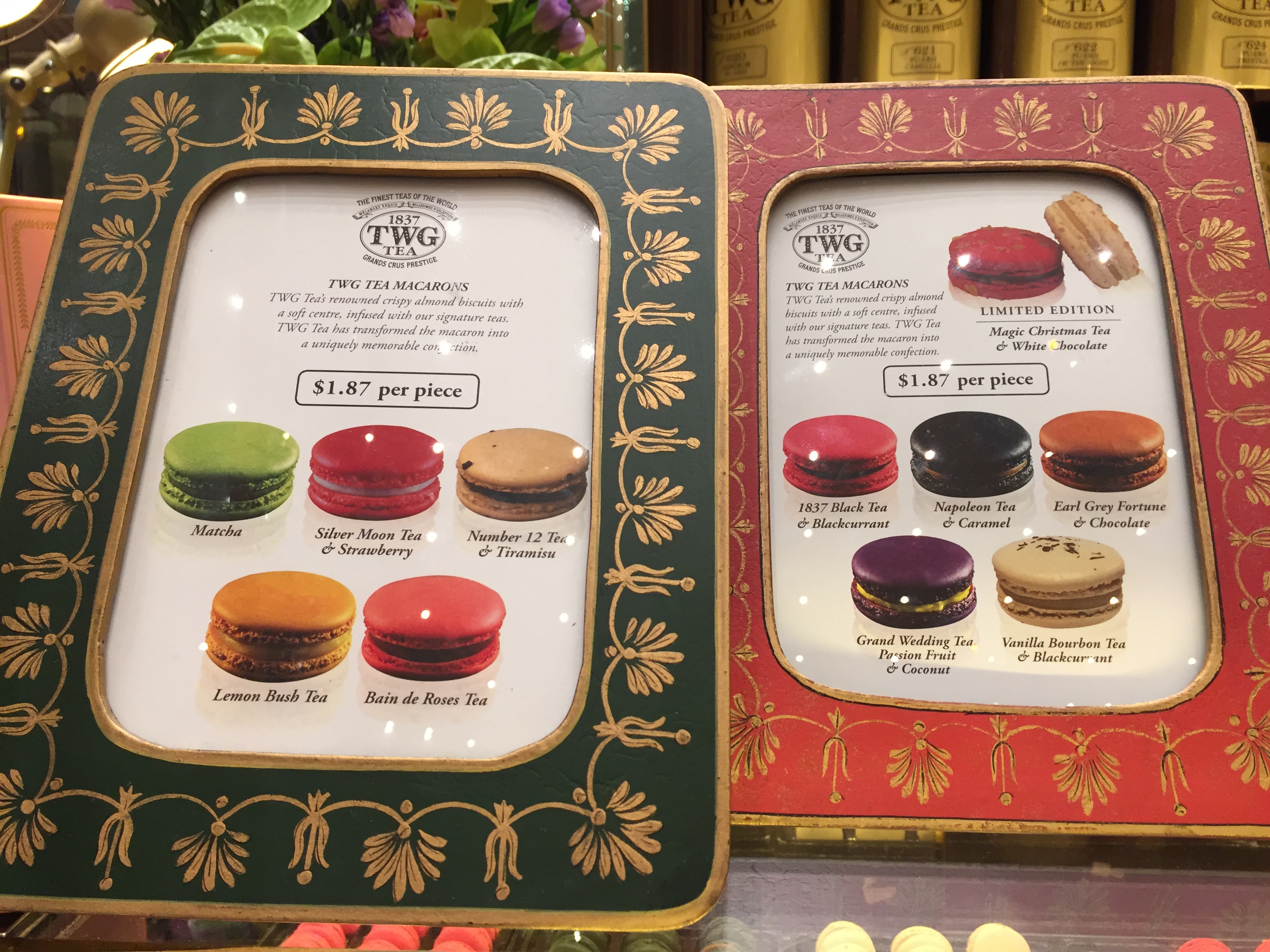 2불도 안되는 가격으로 티를 이용한 다양한 마카롱을 맛볼 수 있어요. 물론 단 한 개만 먹었을때이지요.