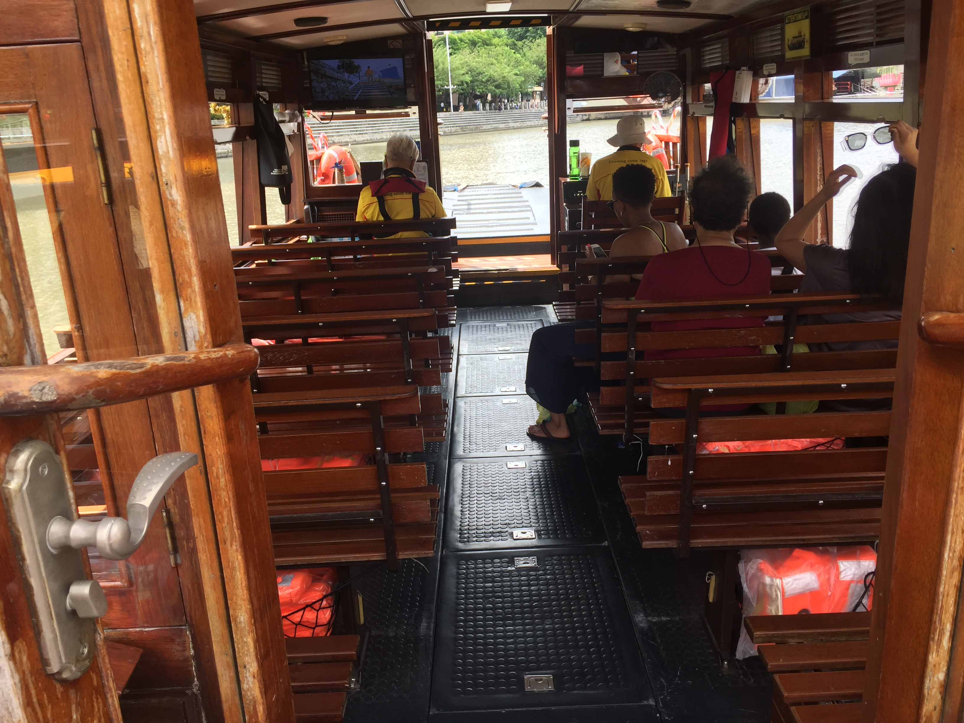 나무로 만든 통통배 스타일입니다. 배조종사 한 분과 관리하시는 분 한 분이 타시네요. 의자 아래 구명조끼가 있고요.