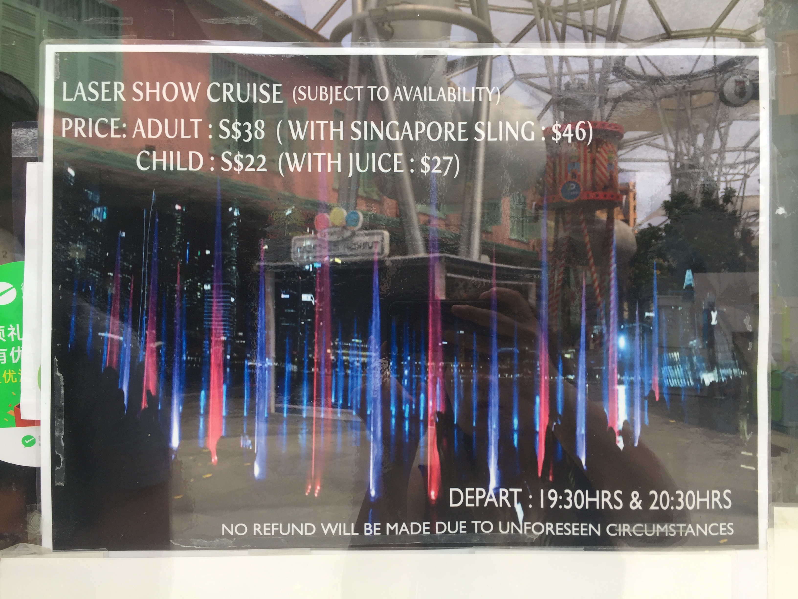 레이져쇼를 볼 수 있는 크루즈는 좀 더 값이 나가는데요. 어른38불 어린이 22불입니다. 싱가포르 슬링을 포함하면 46불불, 어린이는 주스포함 27불이고요. 레이저쇼 시간이 좀 되니까 배에서 뭔가 마시면서 보는것도 좋은 것 같아요.