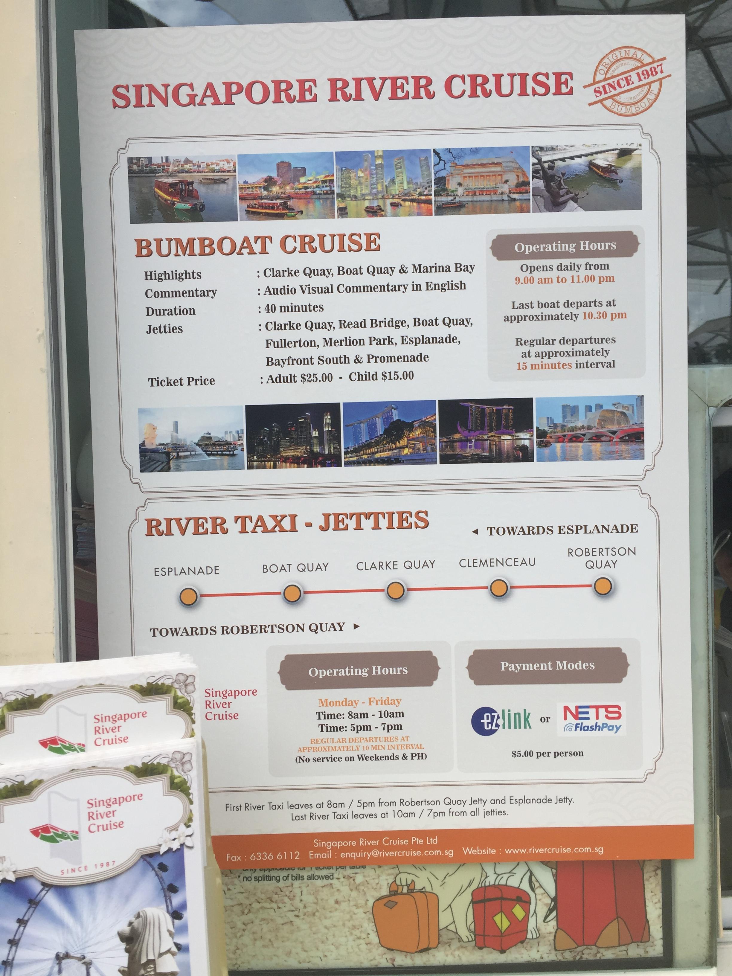 영업시간은 오전 9시부터 오후 11시까지이고 마지막 배는 오후 10시반이에요. 보통 15분 간격으로 운행하니 많이 기다리지 않아도 됩니다. 배타고 한바퀴 도는데 걸리는 시간은 40분 정도이고 클락키에서 출발해서 마리나베이둘러서 다시 돌아오는 코스에요. 금액은 어른25불, 어린이15불(싱가포르 달러)로 탈만한 가격으로 느껴졌습니다.