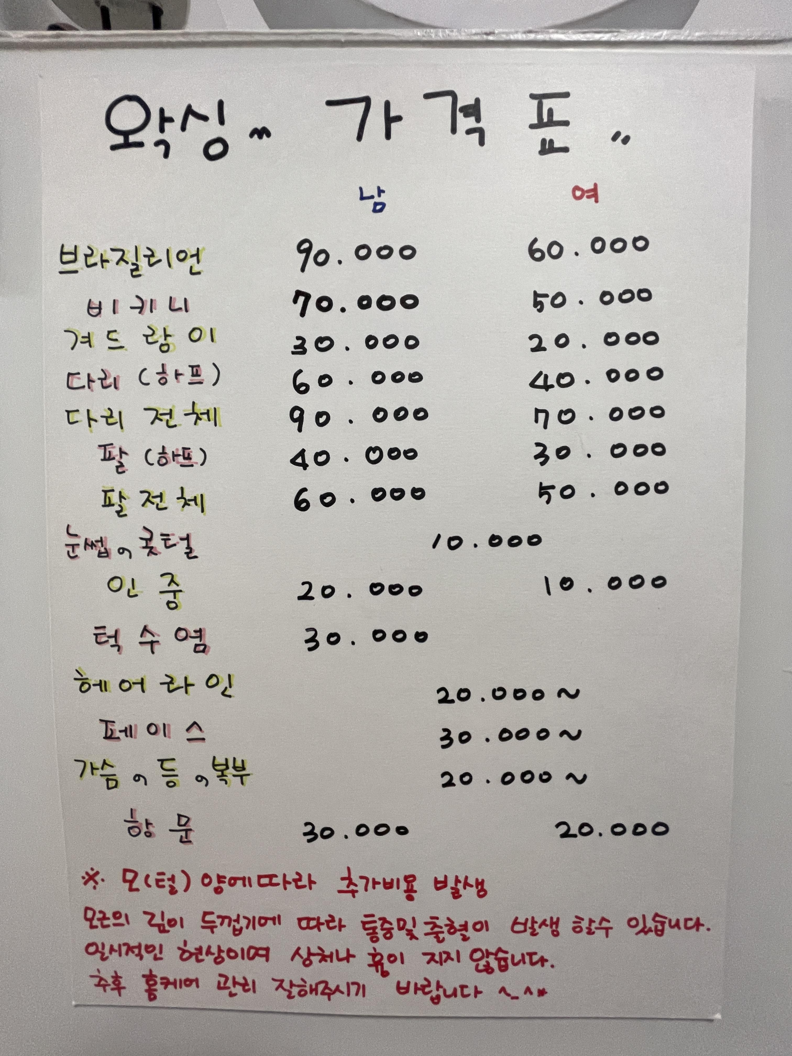 부위별 왁싱 가격표는 다음과 같은데 마통 어플로 예약하면 할인가능하고, 원장님께 직접 연락해서 문의하신 뒤 예약하는 것이 가장 좋을 것 같습니다.