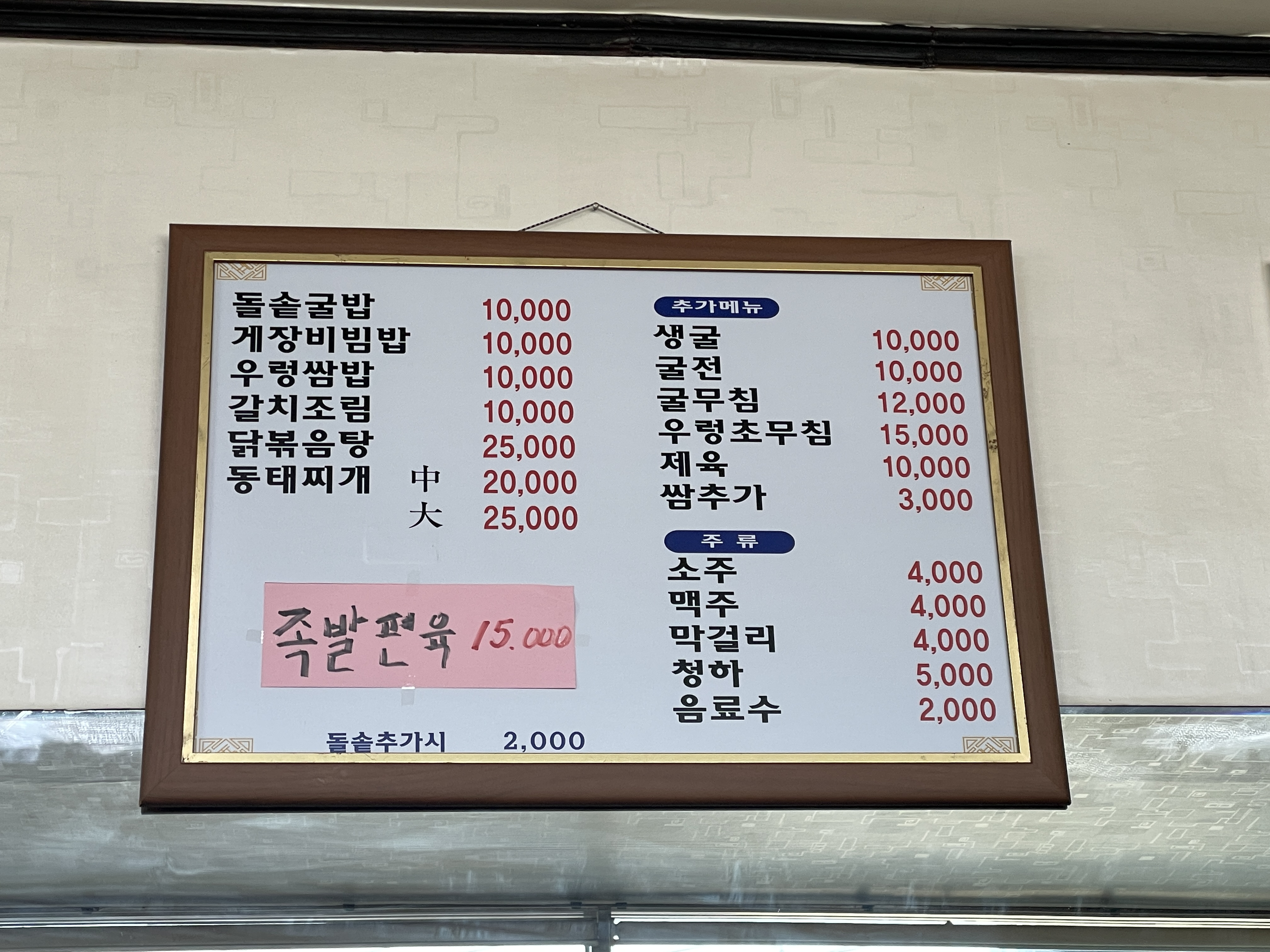 식사 메뉴로는 돌솥굴밥, 게장비빔밥, 우렁쌈밥, 갈치조림, 동태찌개가 있고, 안주겸 식사를 한다면 닭볶음탕이나 우렁초무침 등 꽤 괜찮은 메뉴들이 있었어요. 외부에서 보는 것보다 내부가 넓었고, 신발벗고 들어가는 좌식으로 단체손님도 식사 가능합니다.