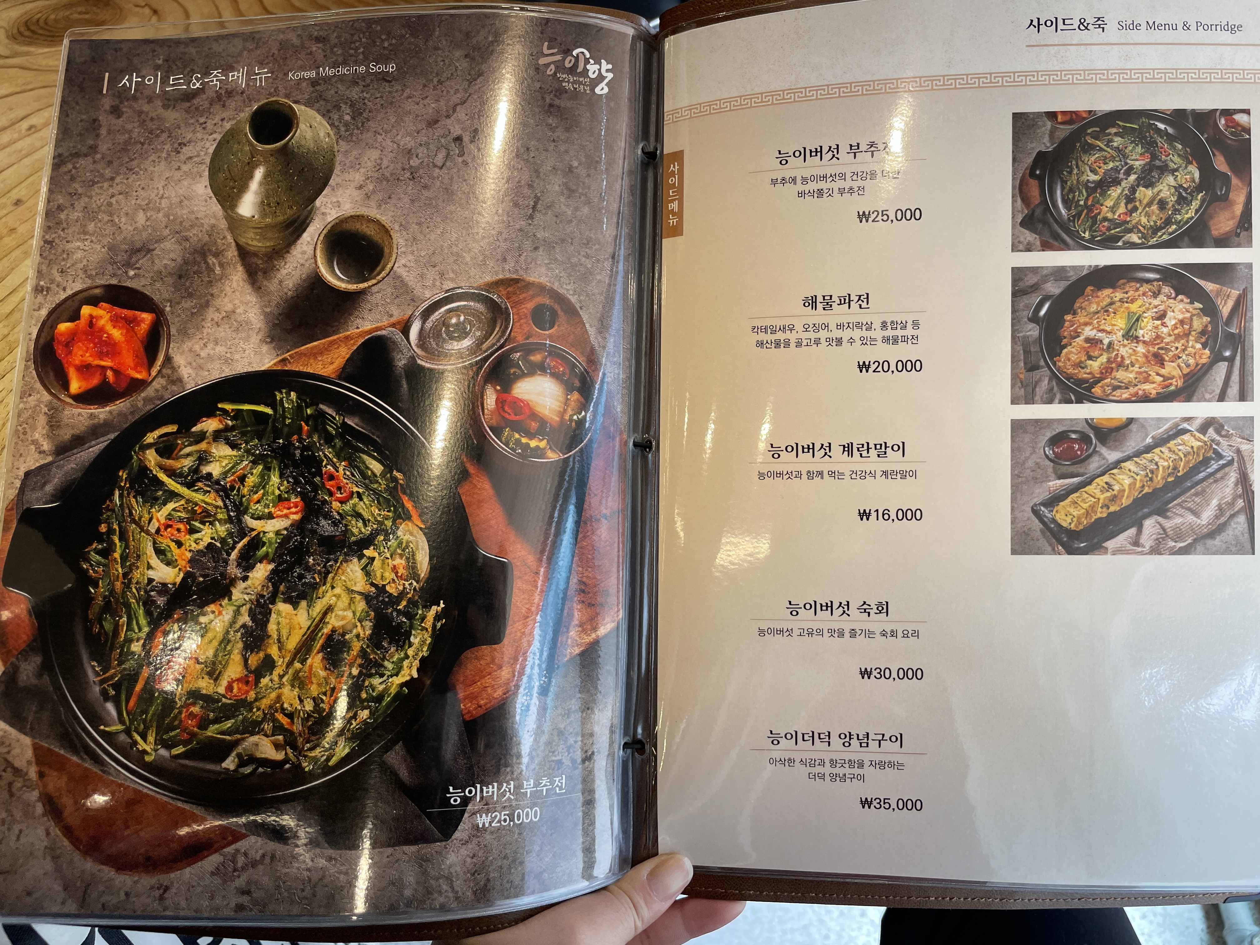 굉장히 다양한 메뉴가 있어요. 능이버섯 부추전, 해물파전, 능이버섯 계란말이, 능이버섯 숙회, 능이더덕 양념구이까지 다양한 방법으로 능이버섯을 즐길 수 있습니다.