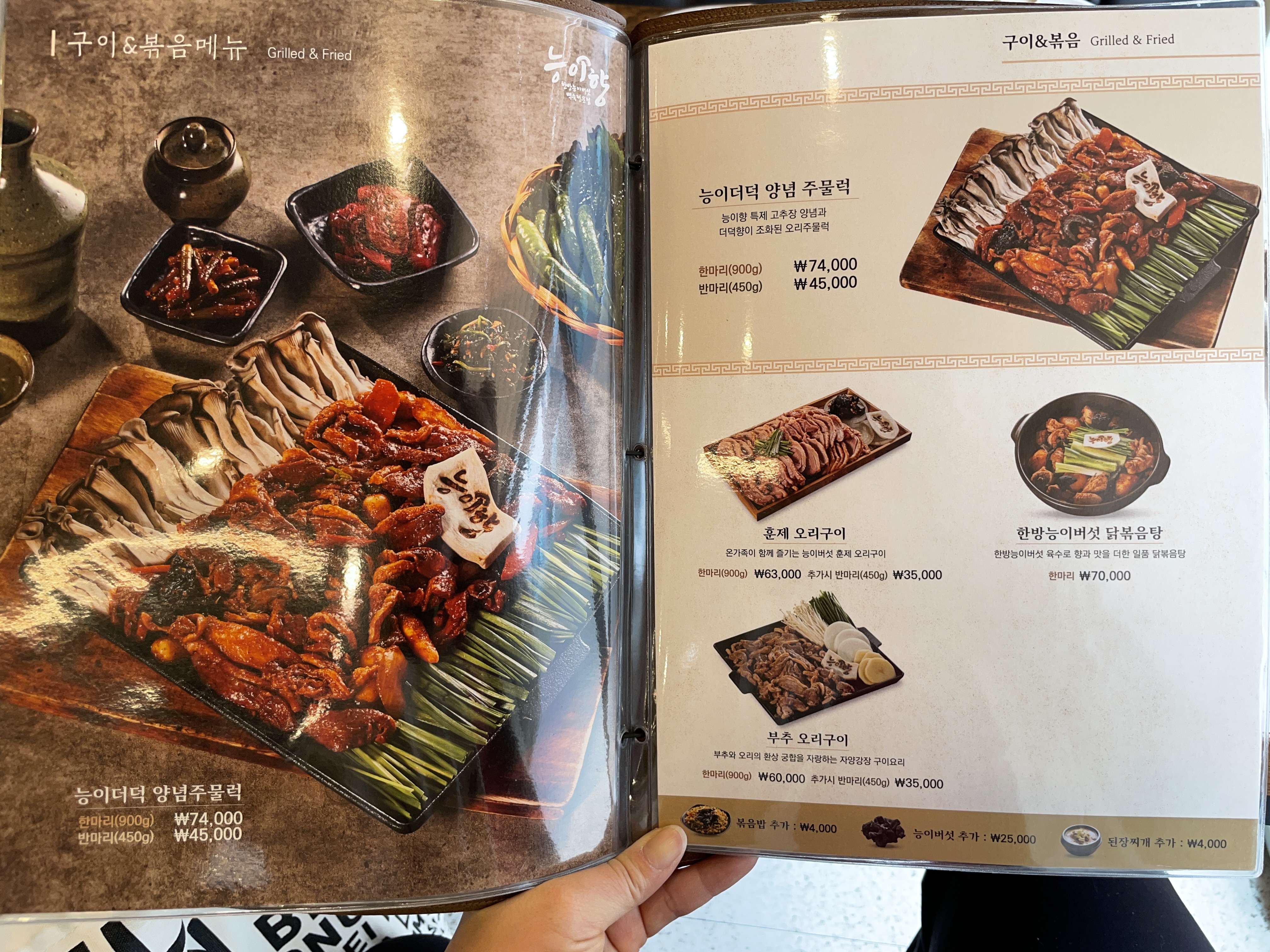 능이더덕 오리양념 주물럭도 있고요, 부추 오리구이도 있습니다. 한방능이버섯 닭볶음탕도 맛있겠어요.