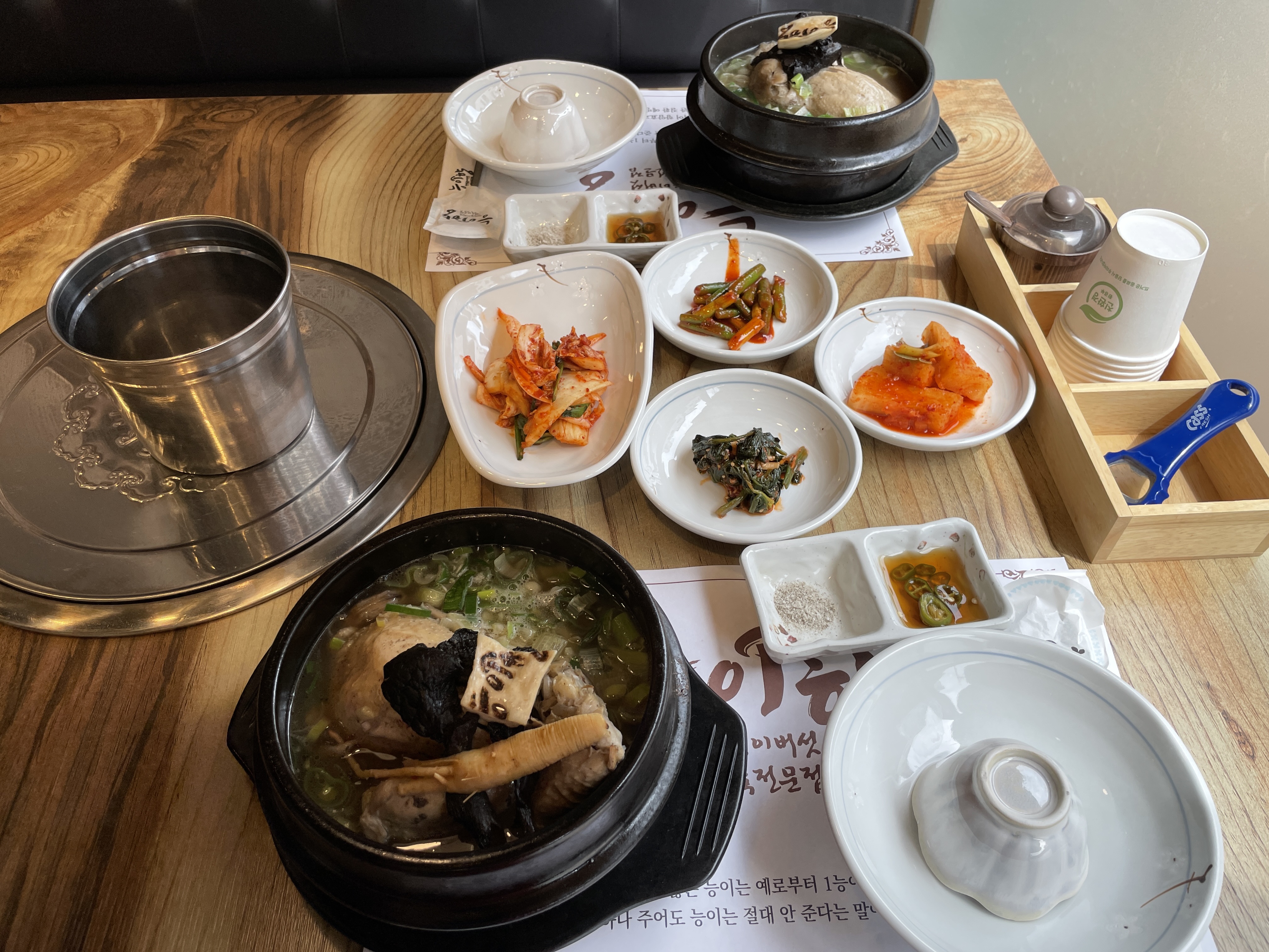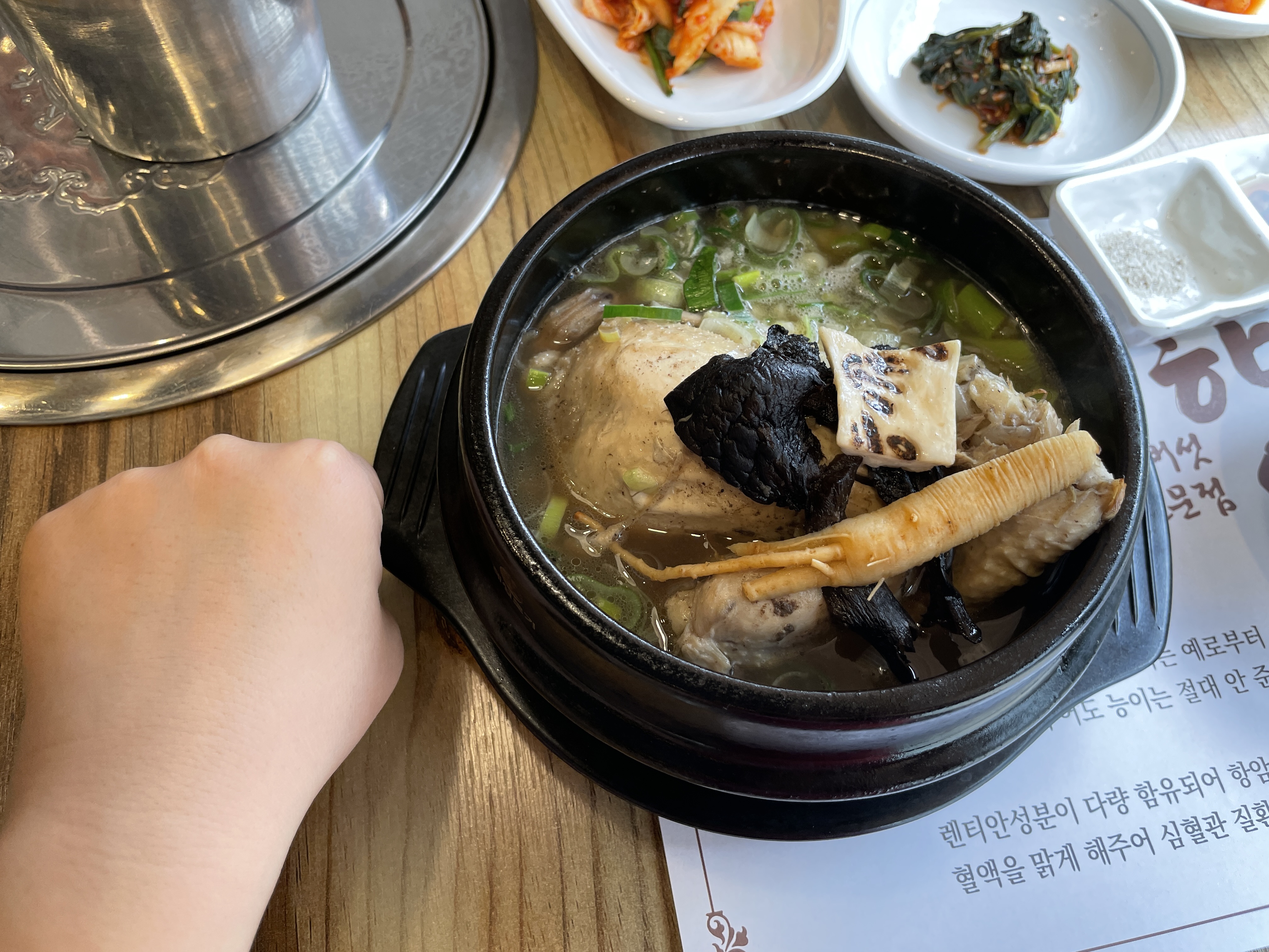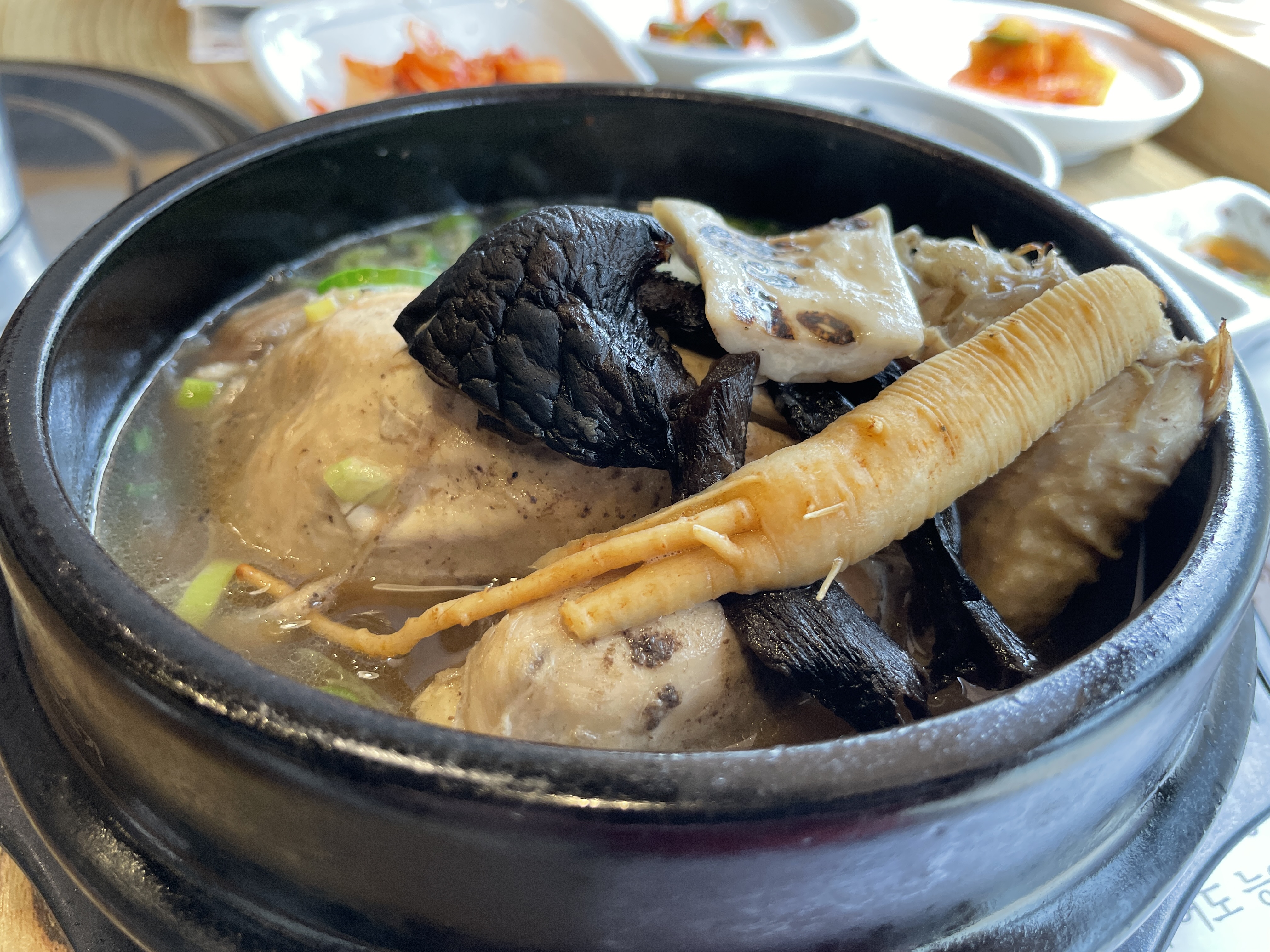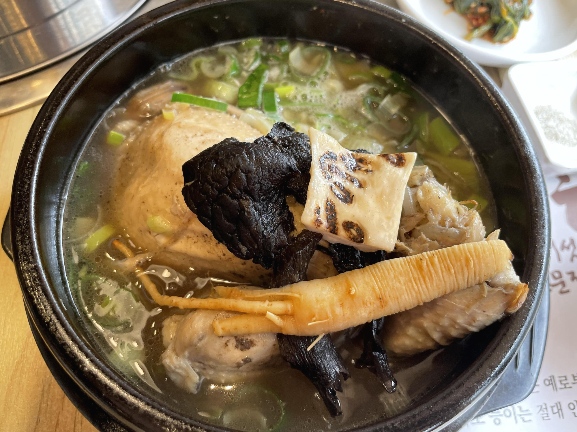 조금 더 기다리니 기다렸던 능이버섯 삼계탕이 나왔습니다. 능이향이라고 불로 지진 새송이가 참 인상적이네요.
