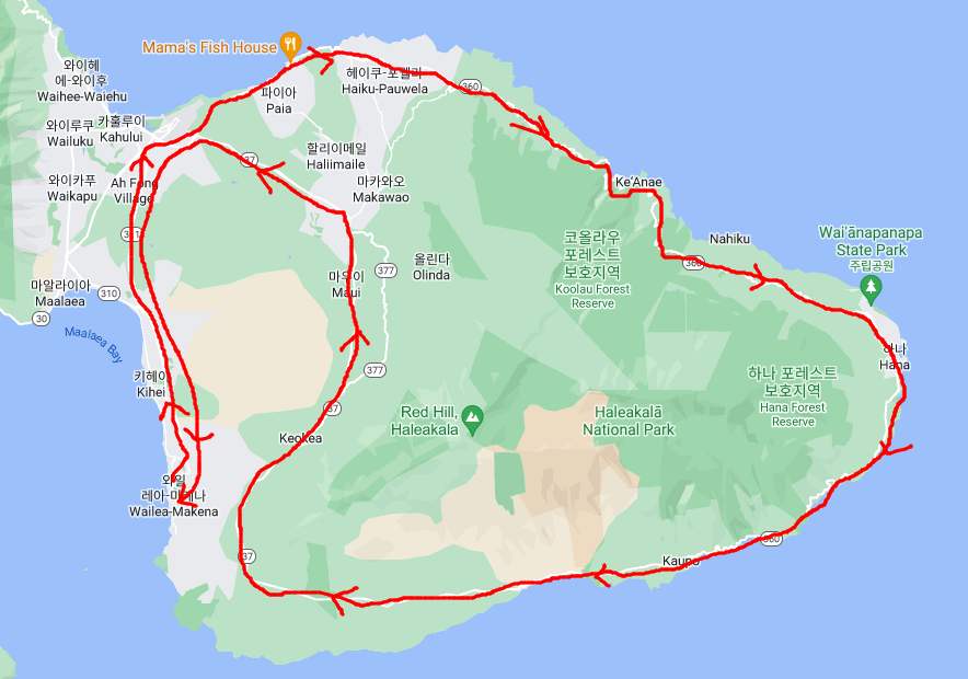 하나로드는 마우이 섬 동남쪽에 있는 Hana 로 가는 60km정도 되는 360번 길을 의미합니다. 좁은 이차선도로라 오고가는 시간이 꽤 걸리고 어떤 곳은 이차선보다도 좁아 서로 양보운전해야하며, 굴곡과 경사가 많아 조심해야해요. 하지만 그만큼 볼거리가 많으니 가야합니다. 이날 계획은 다음과 같이 와일레아 비치에서 떠나 마우이섬 아랫부분을 시계방향으로 돌아 오는 200km가 넘는 경로를 드라이브하는거였어요.