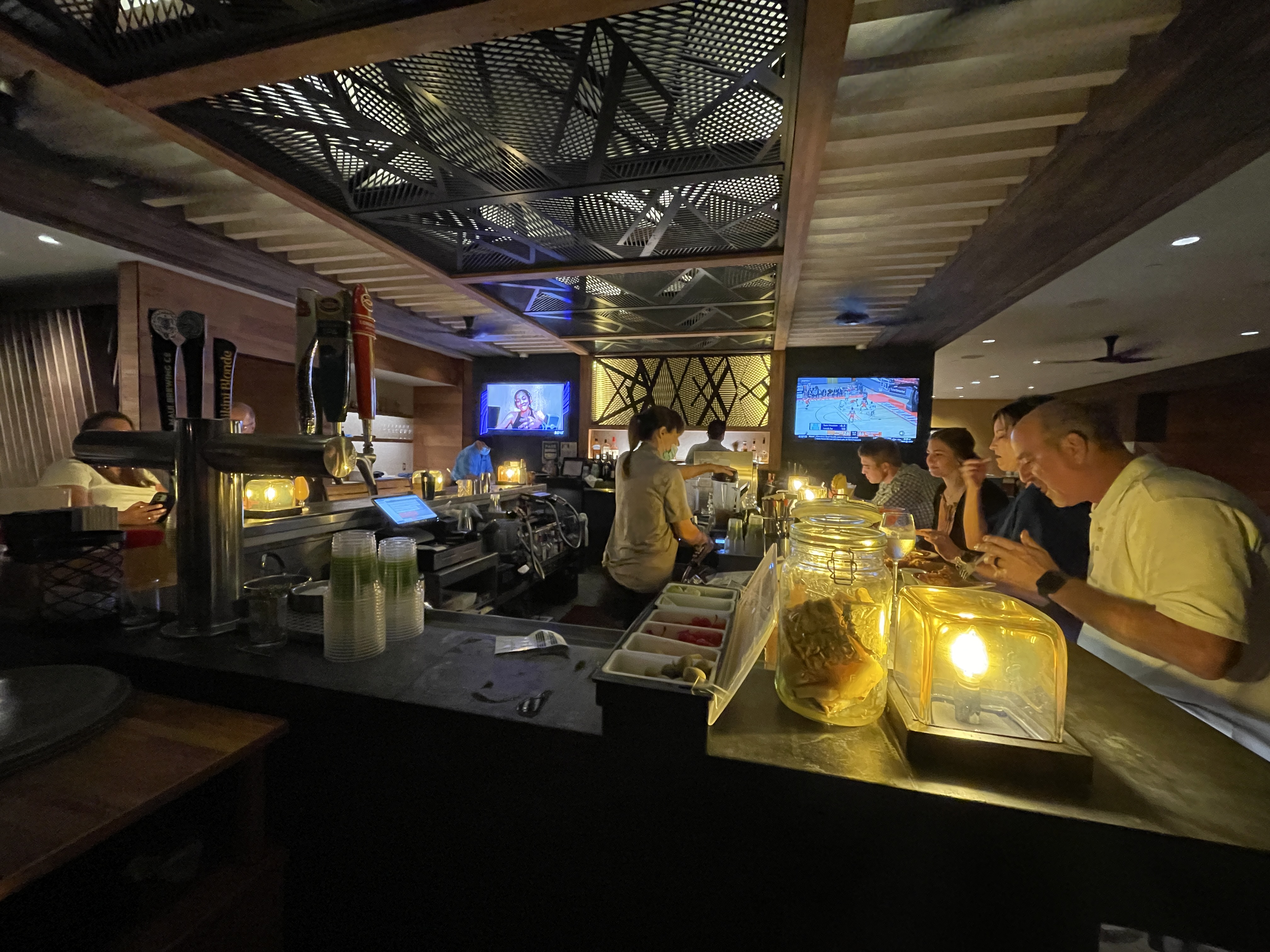 호텔로 돌아오니 이미 해가 진 후였어요. 체크인할 때 받았던 칵테일 교환권을 쓰려고 바에 갔어요.