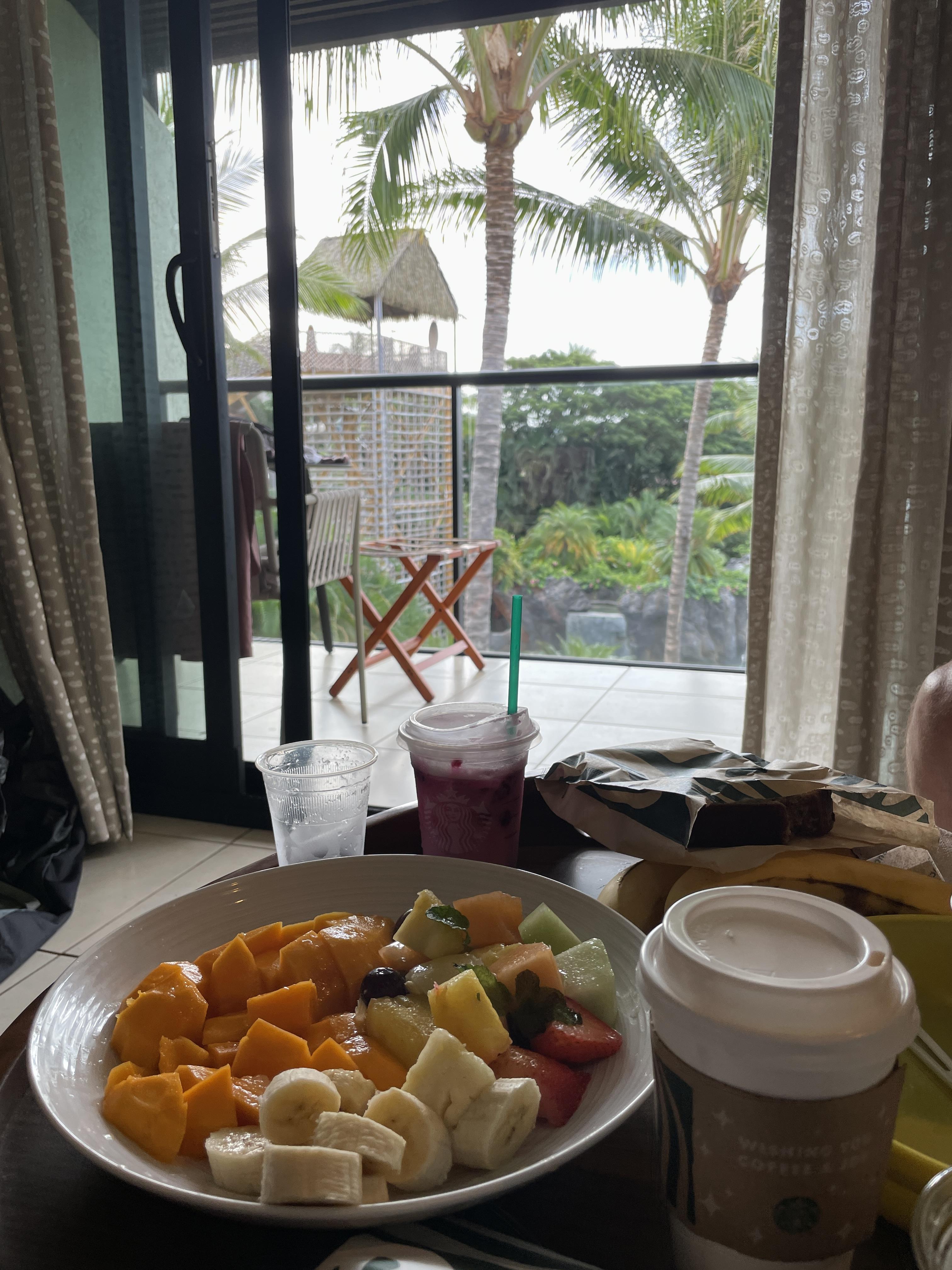 전날 야외 카페에서 받아온 아침이 시원치 않아 다른 선택지인 스타벅스로 갔어요. 역시나 사람이 많아서 줄을 좀 섰고, 한정된 빵 이외의 것을 고르면 추가금액을 내면 되어요.커피와 음료는 거의 한정없고, 아침이라 햄치즈 들어간 샌드위치로 추가금액내고 가져왔어요. 전날 마트에서 산 파파야, 바나나와 아침으로 가져온 과일믹스와 함께 상을 차려봤습니다.