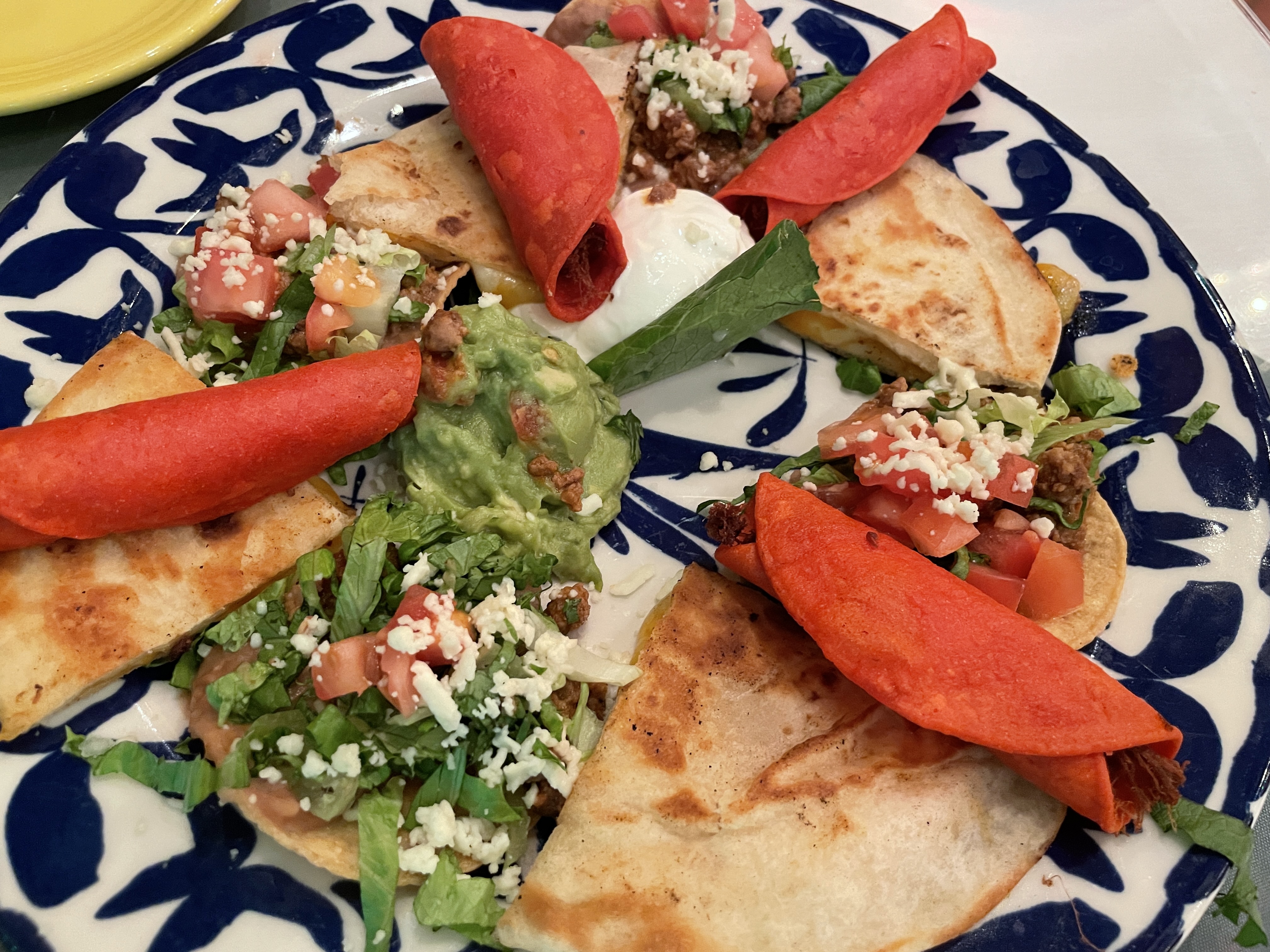 모둠 플레이터가 나왔습니다. 미니타코, 퀘사딜라, 토르티야에 고기 만거랑 과카몰리, 사워크림이 나왔습니다. 둘이서 이거 나눠먹으면 배가 꽤 부를 정도의 넉넉한 양이었어요.