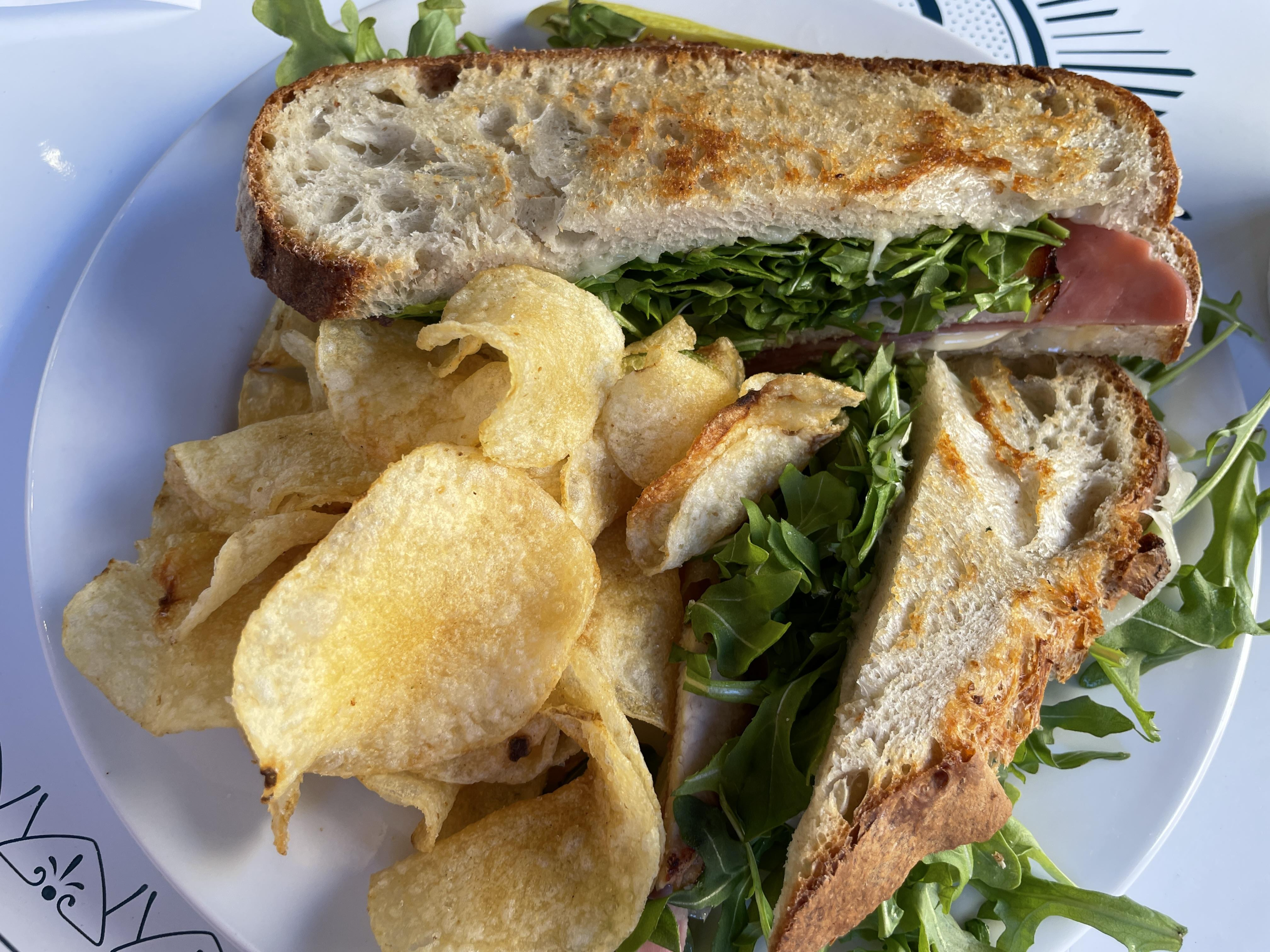 조금 기다리니 음식이 나옵니다. 샌드위치는 감자칩이랑 같이 나왔는데 크기가 꽤 있어서 둘이 나눠먹으니 충분히 요기가 됩니다.
